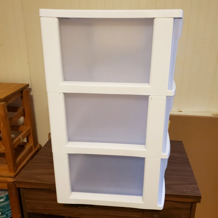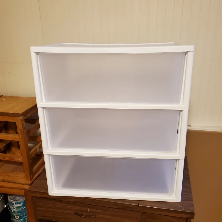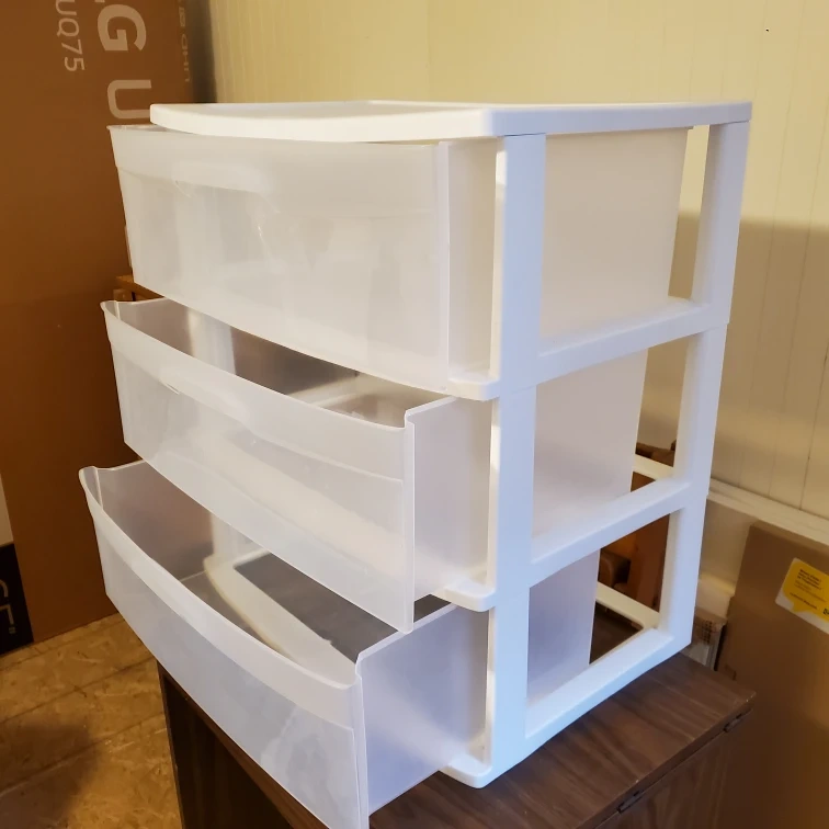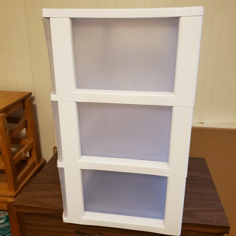 Here's a handy white storage unit with three drawers! It's perfect for organizing clothes, toys, or anything else you need to keep tidy. It's in good condition and light weight. Size: 55 cm wide 39 cm deep 60 cm high