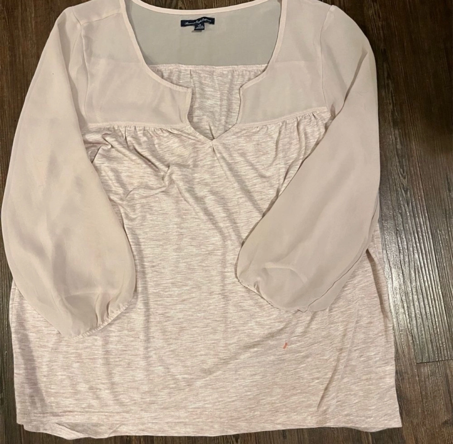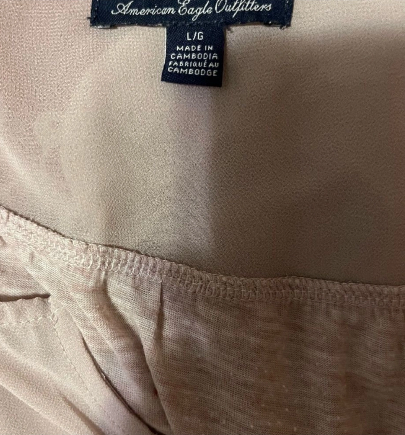A cute American Eagle Outfitters top in size L! It features sheer sleeves and a comfortable fit. Perfect for a casual day out or dressing up for an evening occasion. There are some signs of wear.