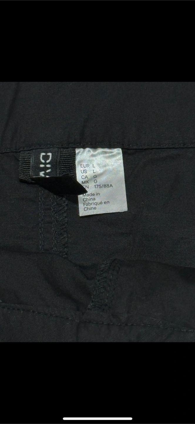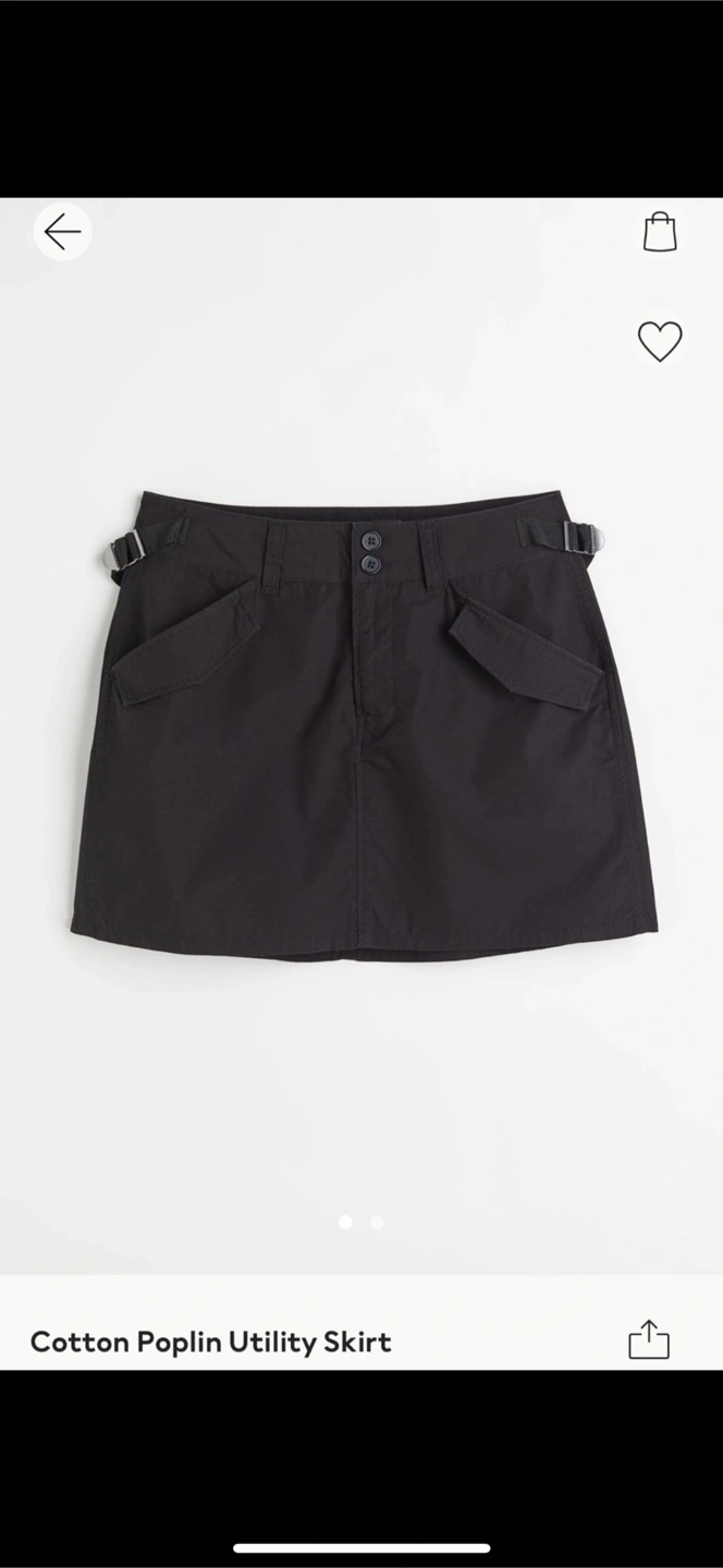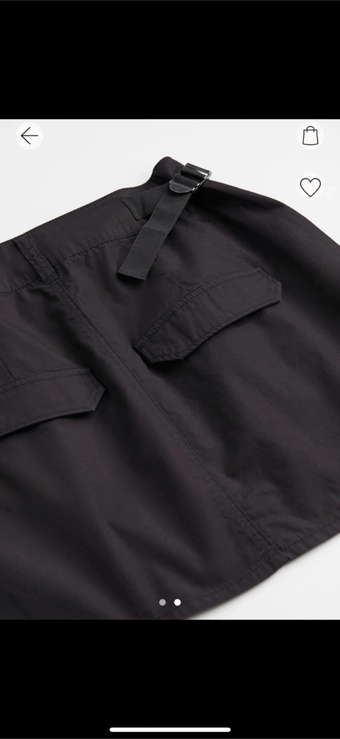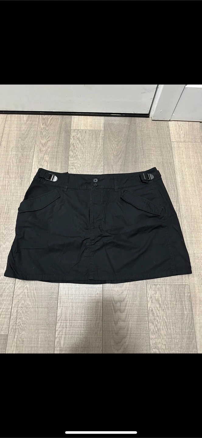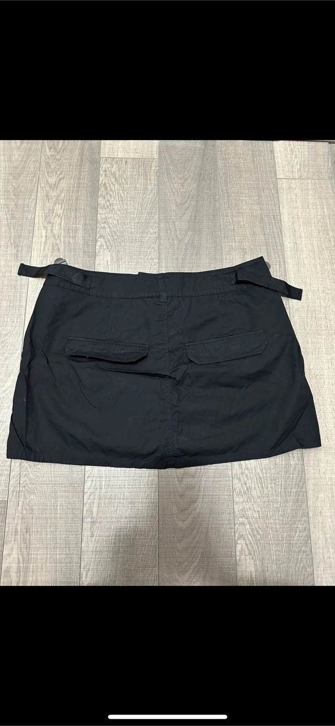 Black cotton poplin utility skirt. Size Large. Features pockets and adjustable straps.