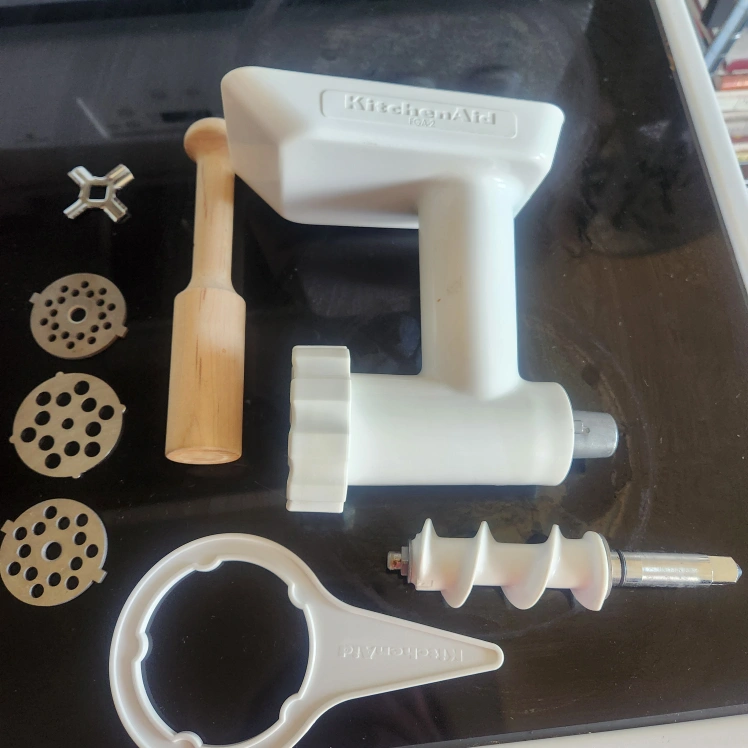 kitchen aide meat grinding attachment, three centerfuge attachments for a variety of grind selections.