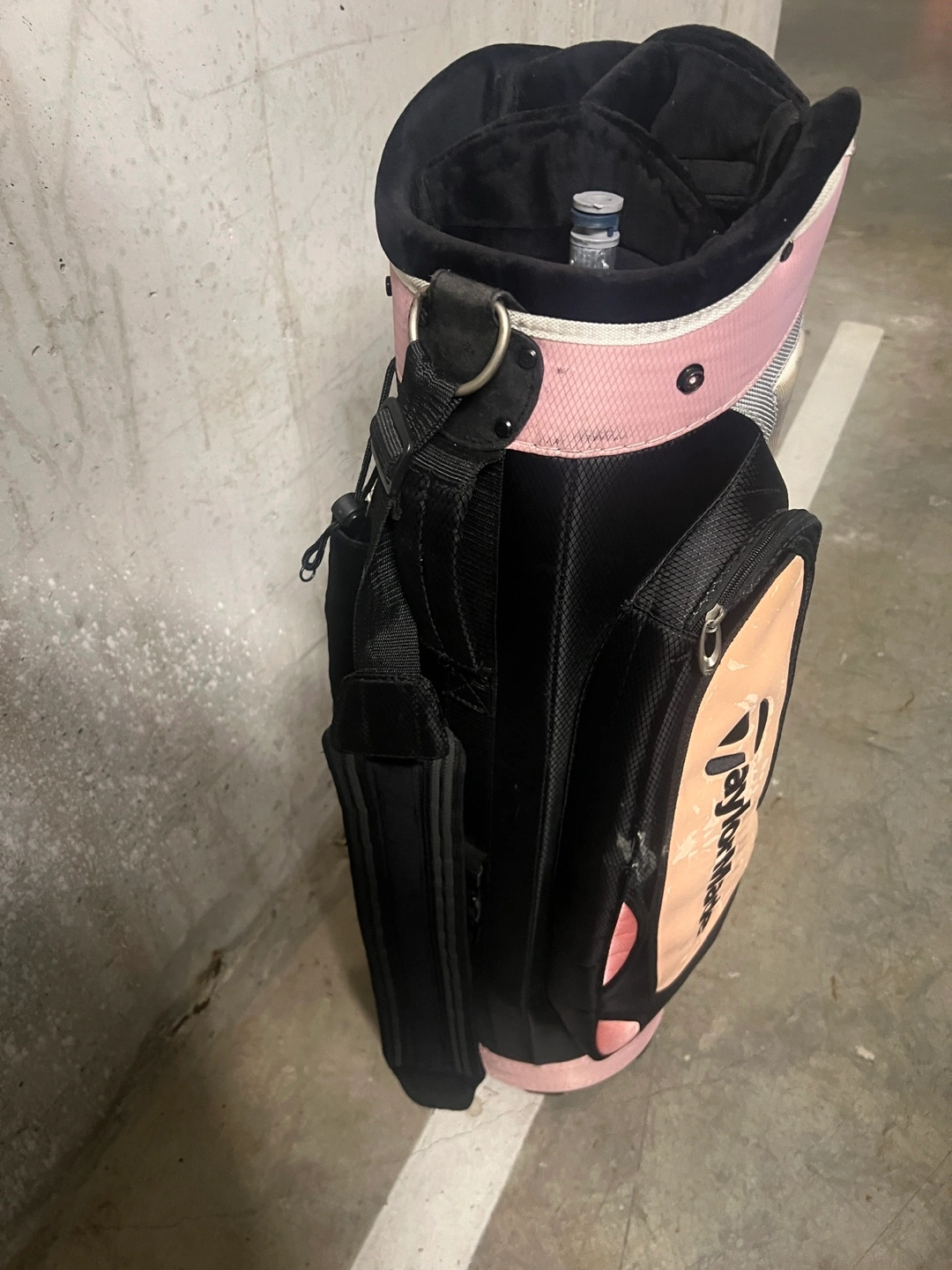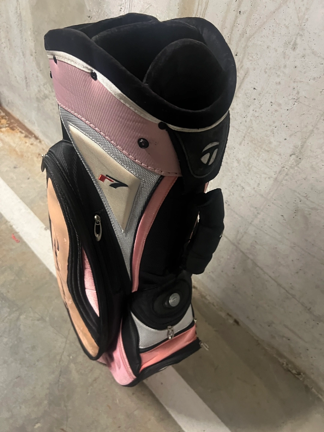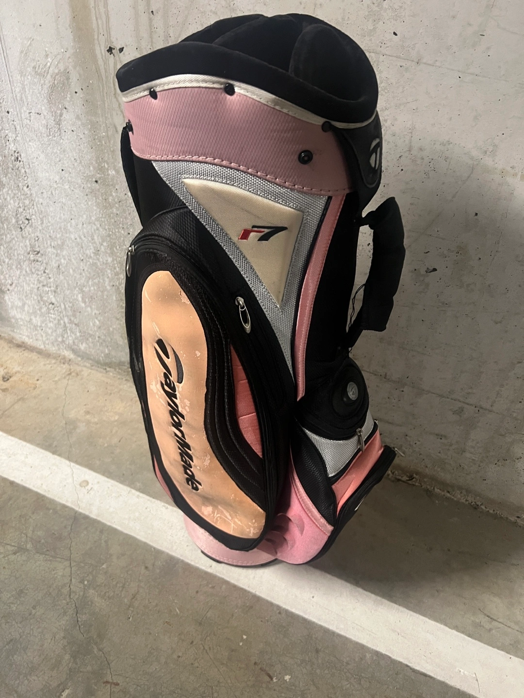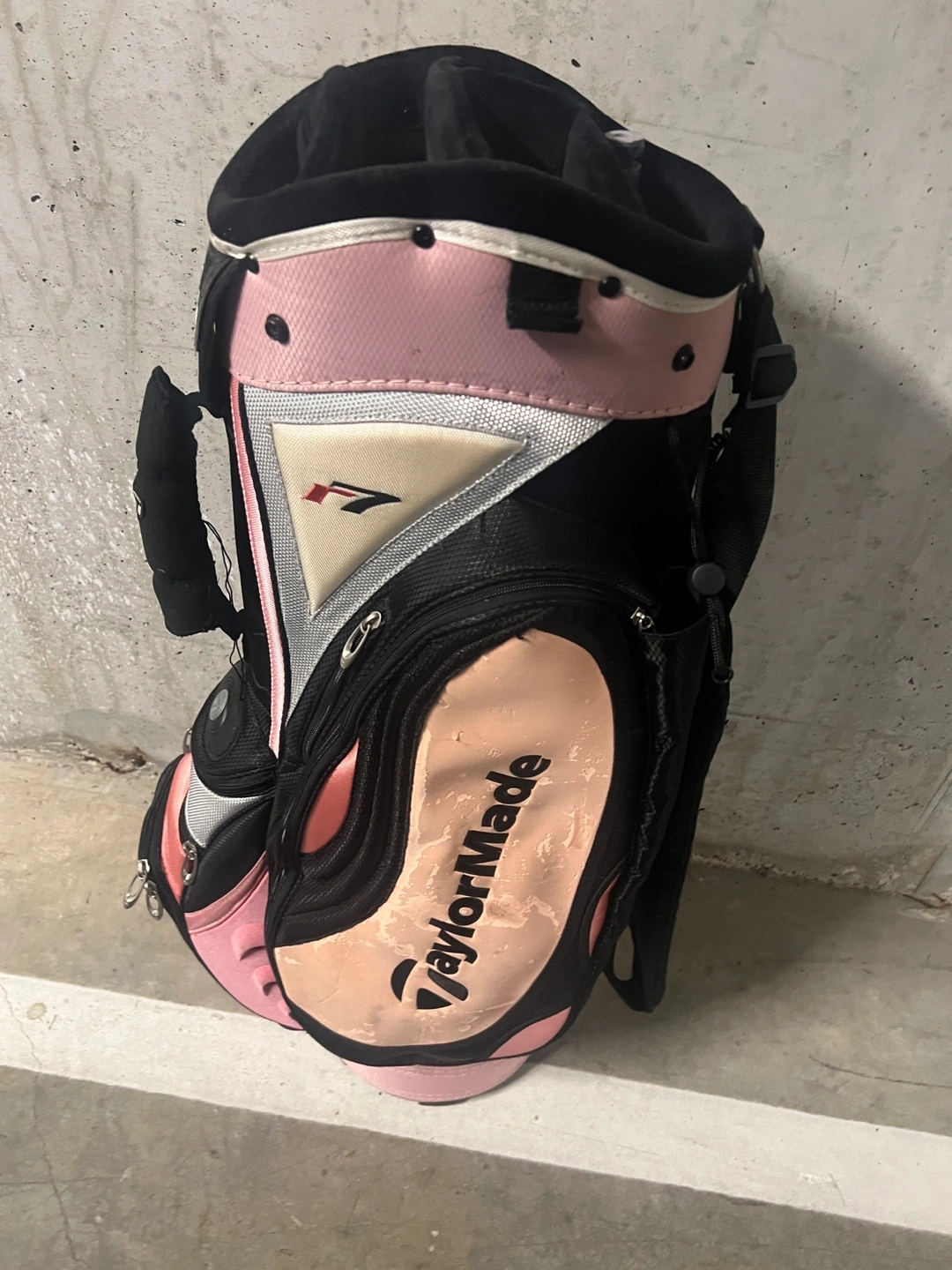 Selling a TaylorMade golf bag in a stylish pink and black colour scheme! It's perfect for carrying your clubs around the course. There are some signs of use, but still in good condition for many more rounds of golf!