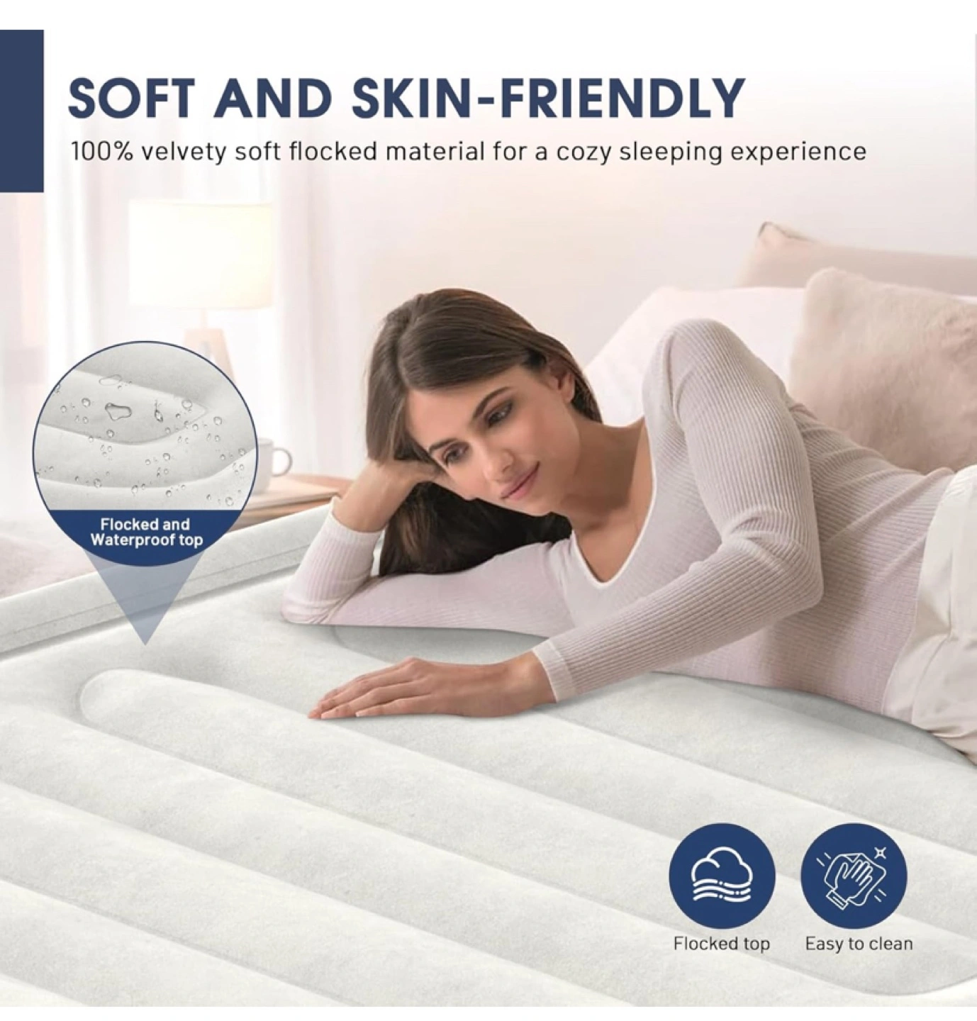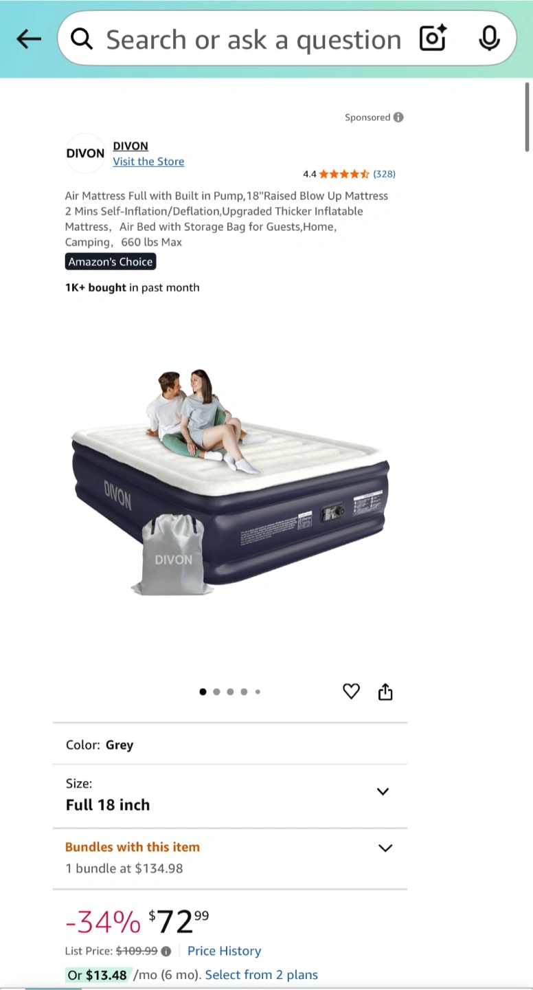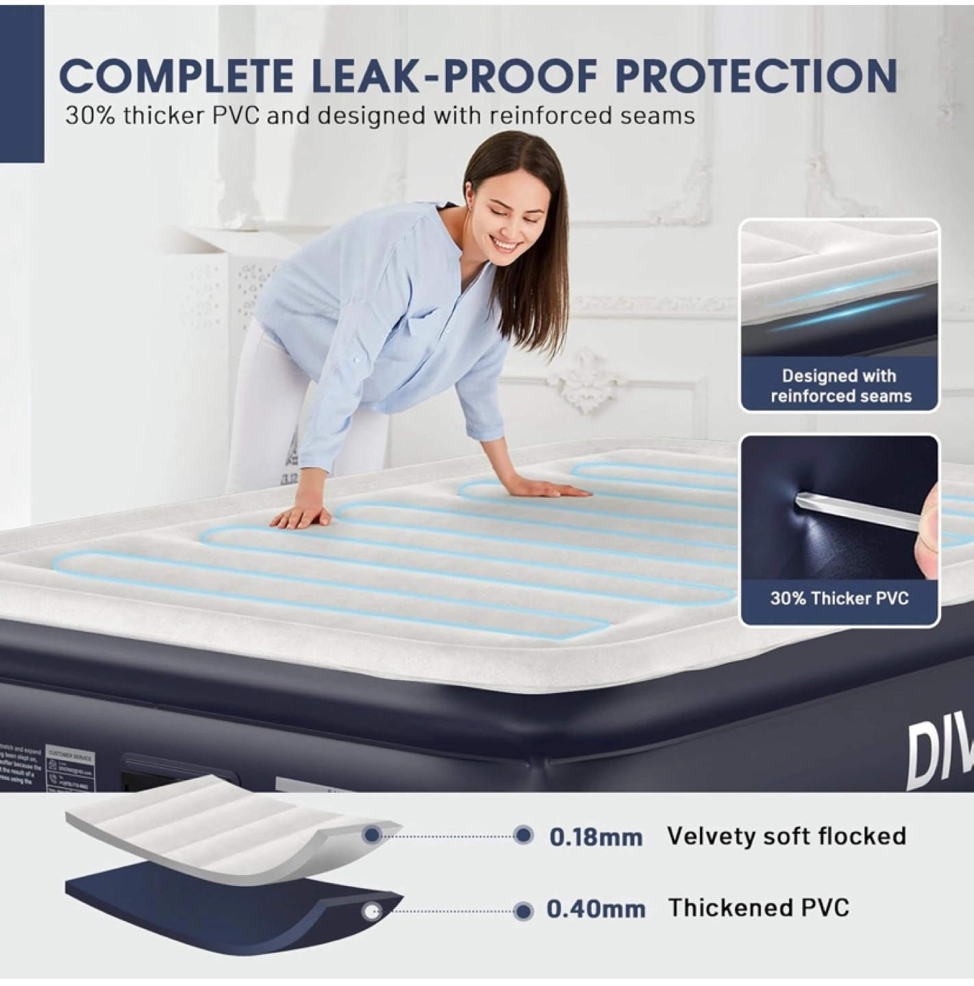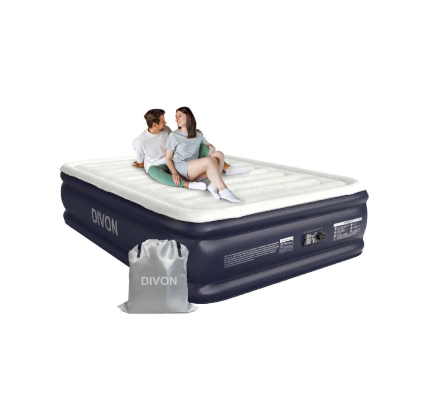 Get ready for guests with this brand new DIVON full-size air mattress! It's designed with complete leak-proof protection, featuring 30% thicker PVC and reinforced seams. The top is a velvety soft flocked material for a cozy sleeping experience.