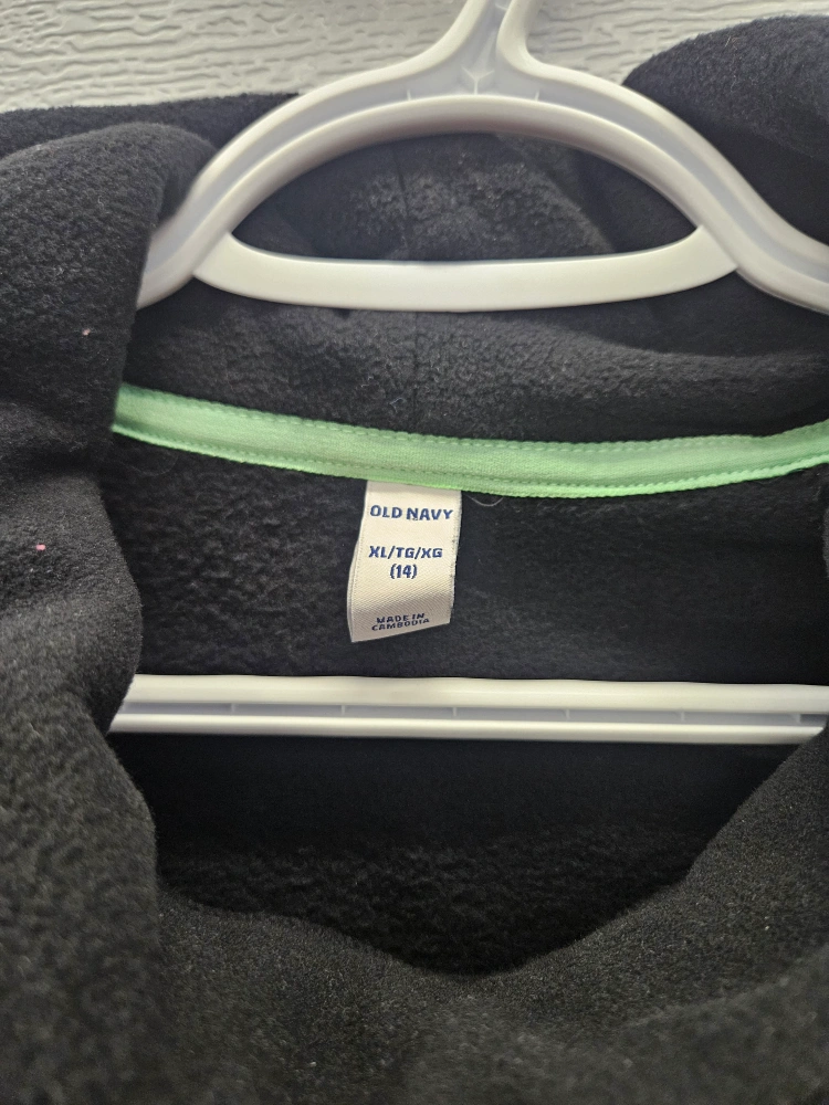 Cozy black fleece pullover from Old Navy, perfect for chilly days! It's a size XL (14) and features a comfy cowl neck and a handy front pocket