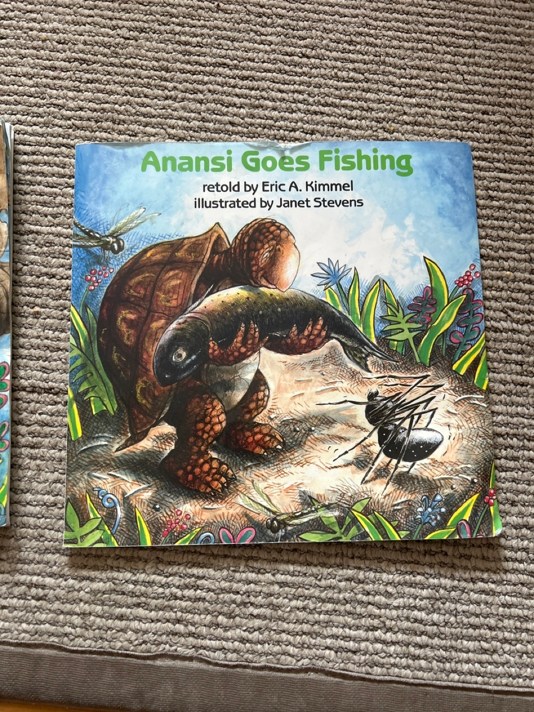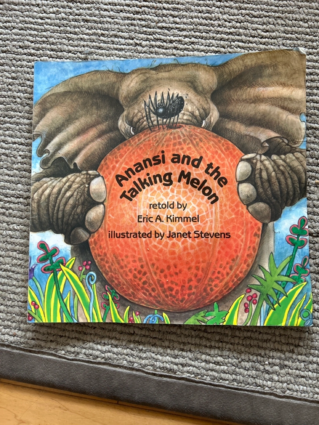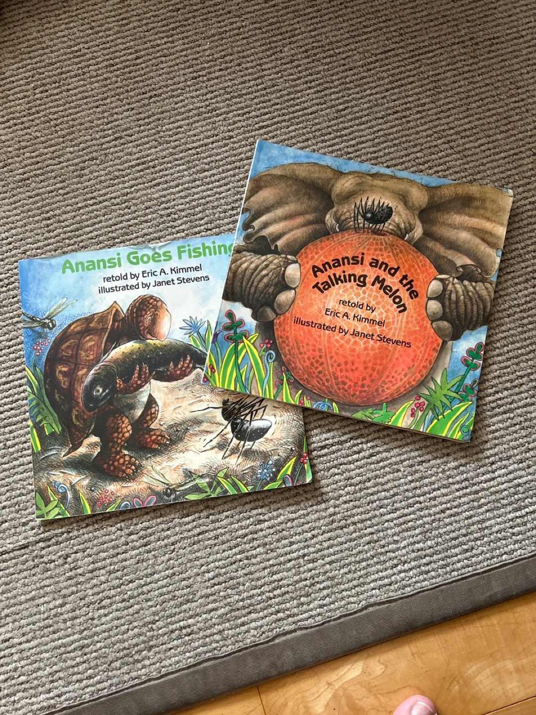 Two books by Eric A. Kimmel and illustrated by Janet Stevens: Anansi and the Talking Melon, and Anansi Goes Fishing! Both are in good condition and ready for a new home