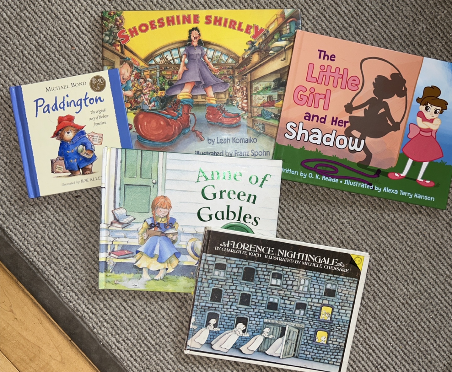 Selling a set of children's hardcover books including: - Paddington by Michael Bond - Shoeshine Shirley by Leah Komaiko - Anne of Green Gables - The Little Girl and Her Shadow by O.K. Reade - Florence Nightingale by Charlotte Roch