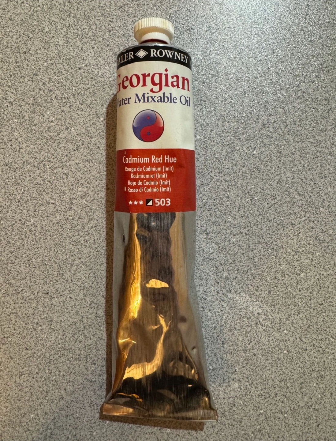 Selling a tube of Daler Rowney Georgian Water Mixable Oil in Cadmium Red Hue. It's a 200ml (6.76 US fl.oz) tube. Perfect for artists looking for quality oil paints that can be mixed with water! Opened and Used around 5ml.
