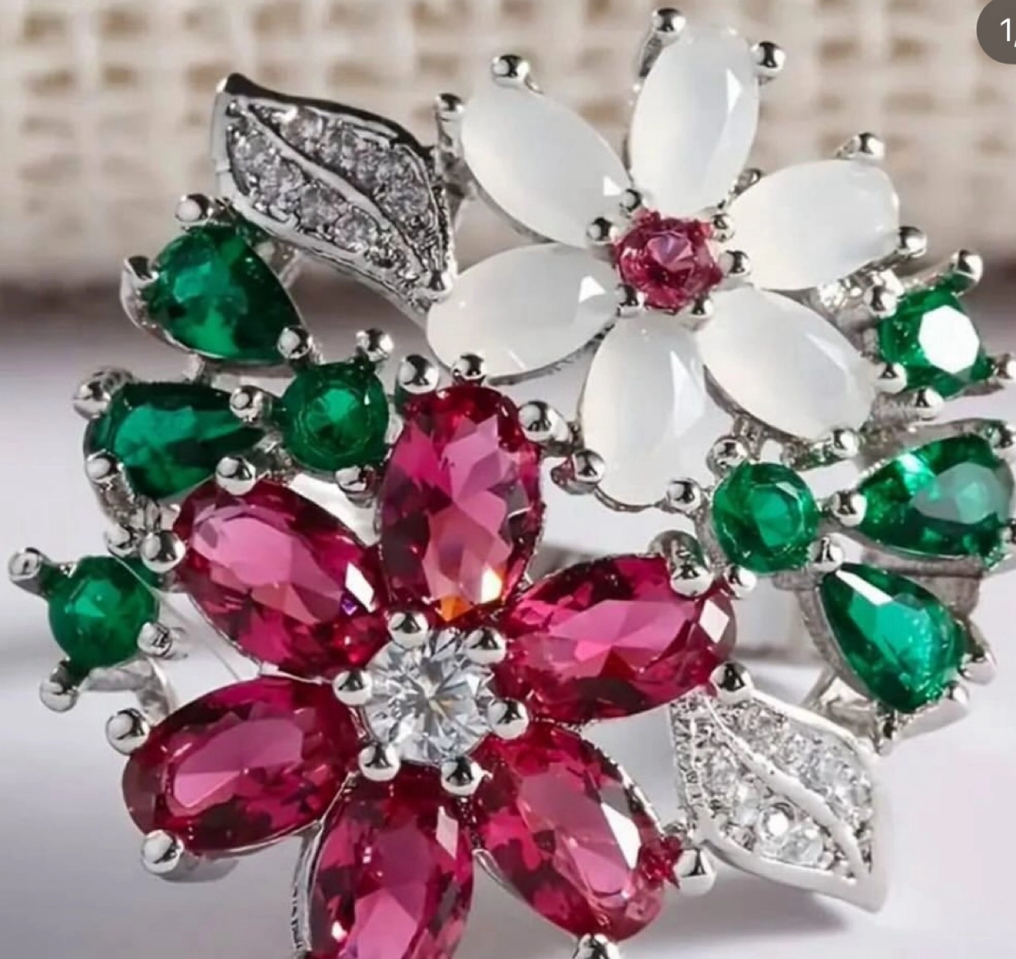 This ring features a beautiful flower design with pink, white, and green stones. It's a lovely statement piece!