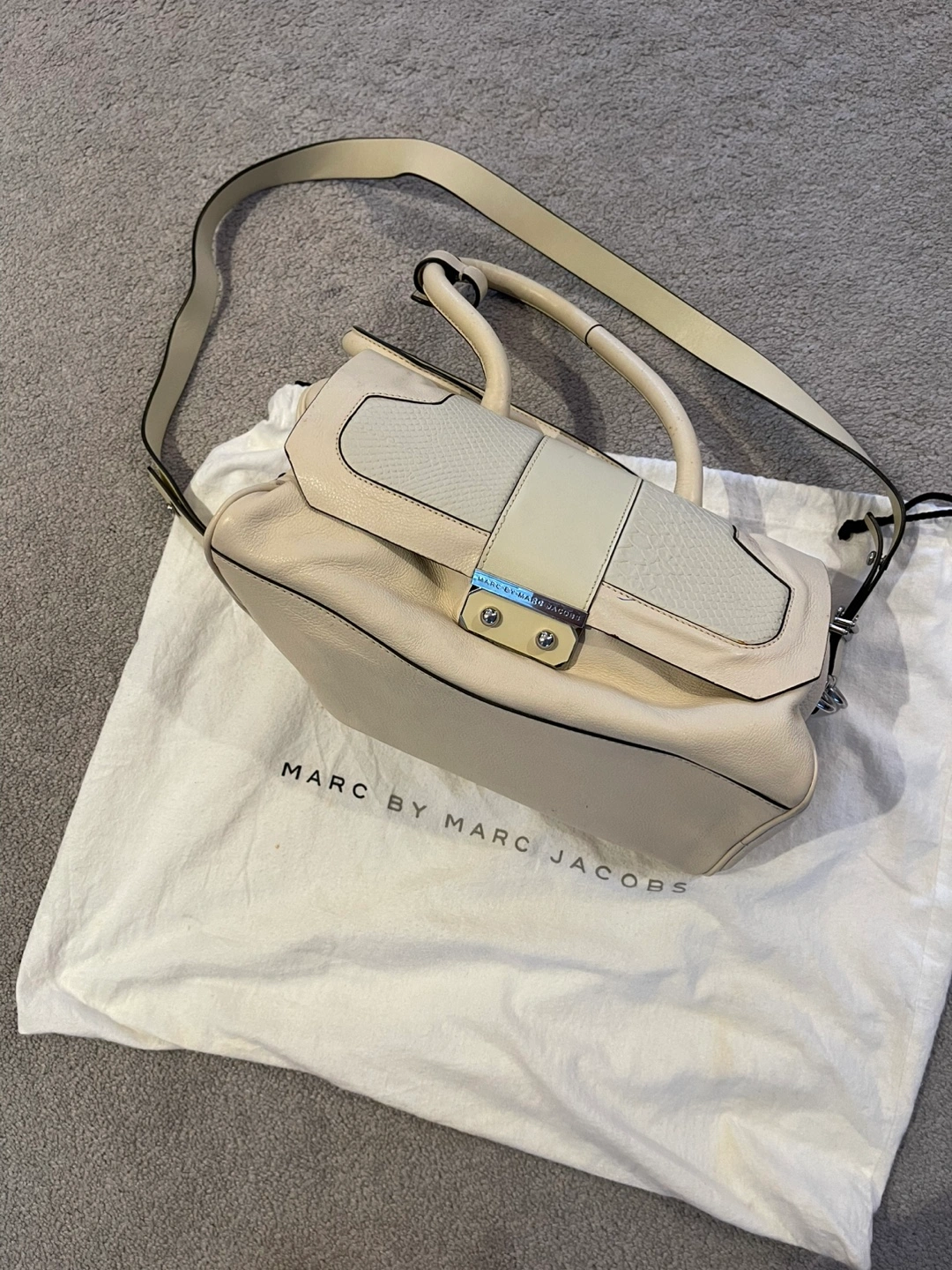 Selling a Marc by Marc Jacobs handbag in a lovely beige colour. It's made of 100% cow leather and has a unique design with some snakeskin-like texture details. There are some signs of wear, including a few spots and a small mark, but overall it's still a stylish bag! Inside is new but outside was left in storage so a bit of marks OBO.
