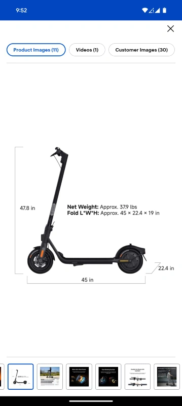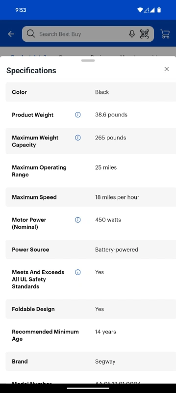 I'm selling a mint condition Segway electric scooter in black! It has a maximum operating range of 25 miles and a maximum speed of 18 miles per hour. The motor power is 450 watts, and it's battery-powered. It also has a foldable design! It weighs 38.6 pounds and can hold a maximum weight capacity of 265 pounds.