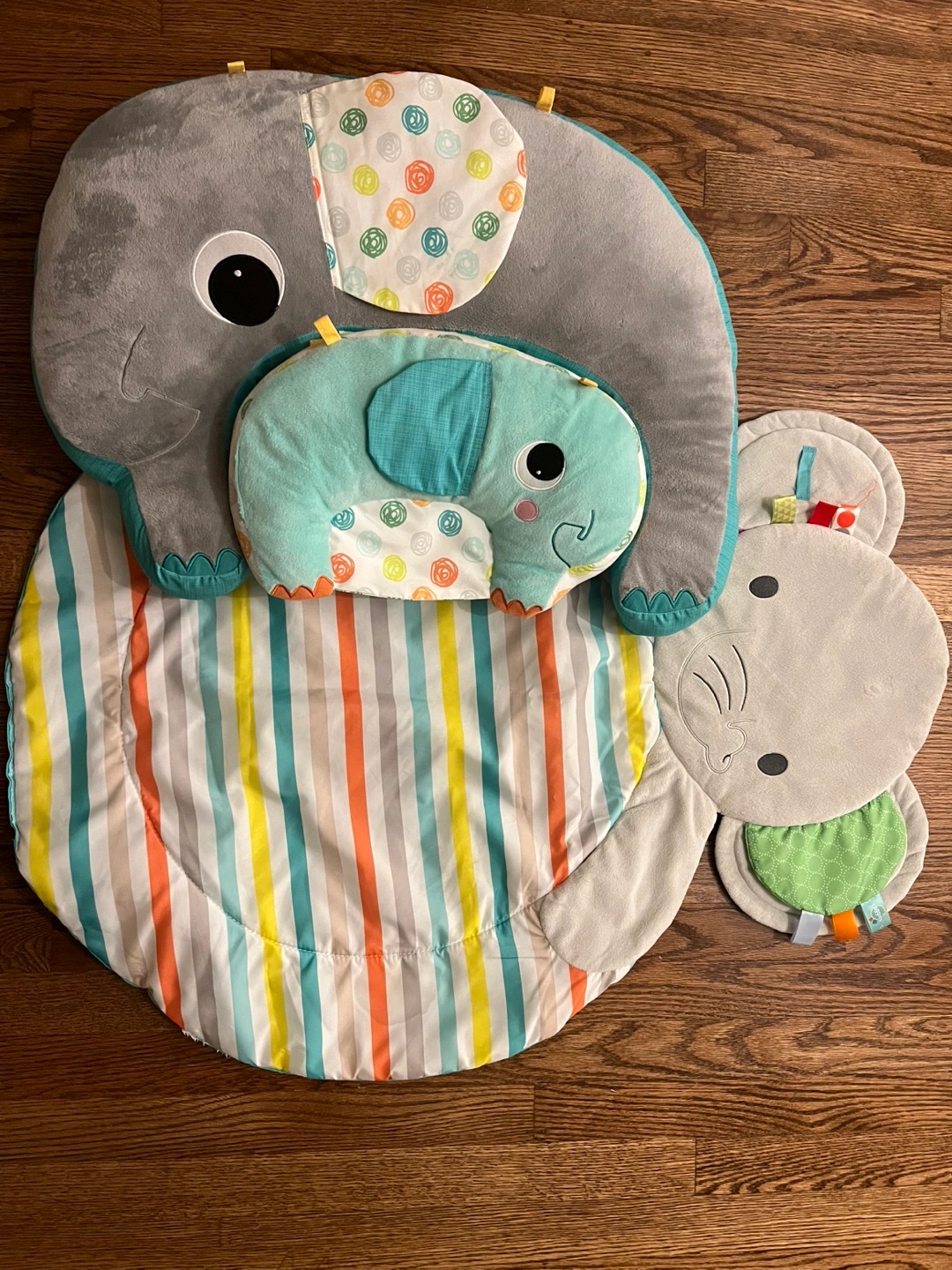 This is a super cute Infantino elephant-themed tummy time play mat! It's in great condition and ready for a new little one to enjoy. The set includes a soft elephant mat, a supportive tummy time pillow.
