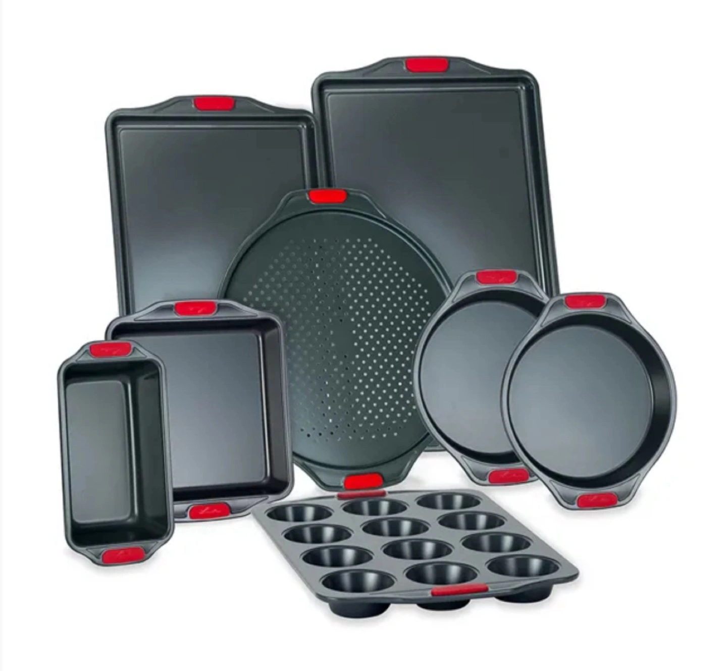 Set includes 1 Cookie Sheet (10 x 15"), 1 Cookie Sheet (11 x 17"), 1 Cake Pan (9"), 1 Cake Pan (9"), 1 Square Cake Pan (9"), Loaf pan (9 x 5"), 1 Muffin Pan (12 Cups), 1 Pizza Pan (14").