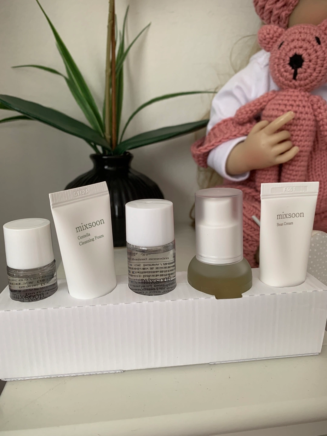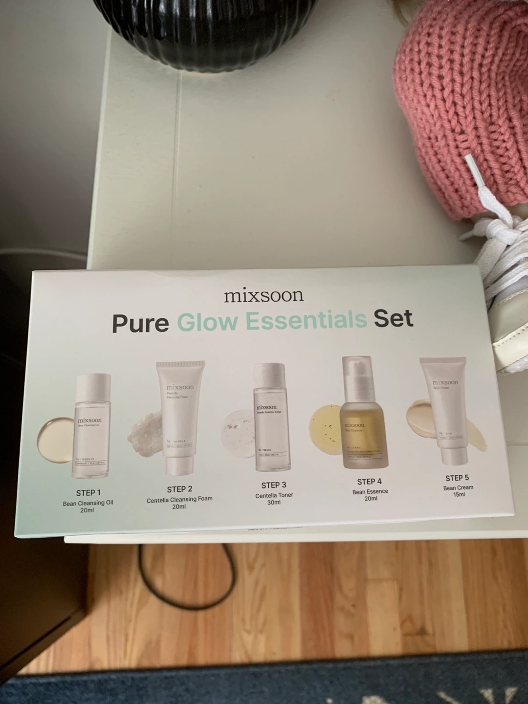 I'm selling a brand new Mixsoon Pure Glow Essentials Set! This set includes five essential steps for glowing skin: Bean Cleansing Oil (20ml), Centella Cleansing Foam (30ml), Centella Toner (30ml), Bean Essence (30ml), and Bean Cream (10ml)