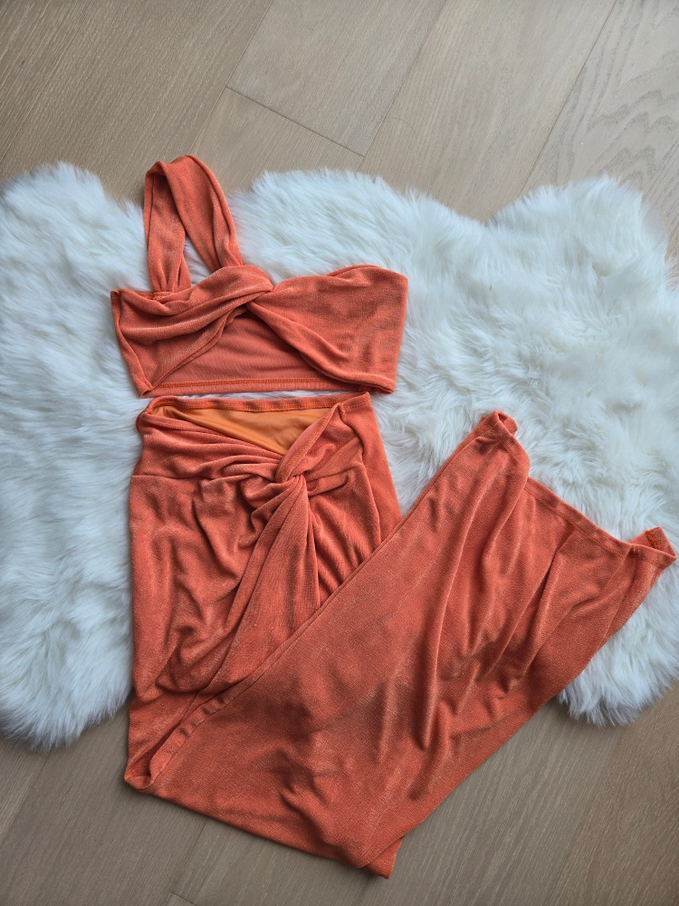Cute orange two-piece set from SHEIN! The set includes a crop top and a skirt with a knot detail. Perfect for a summer day or night out