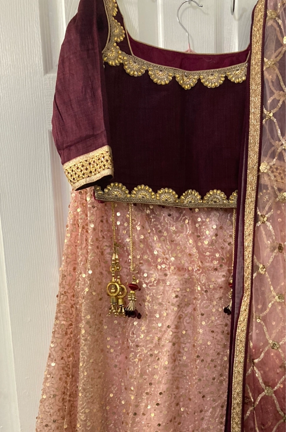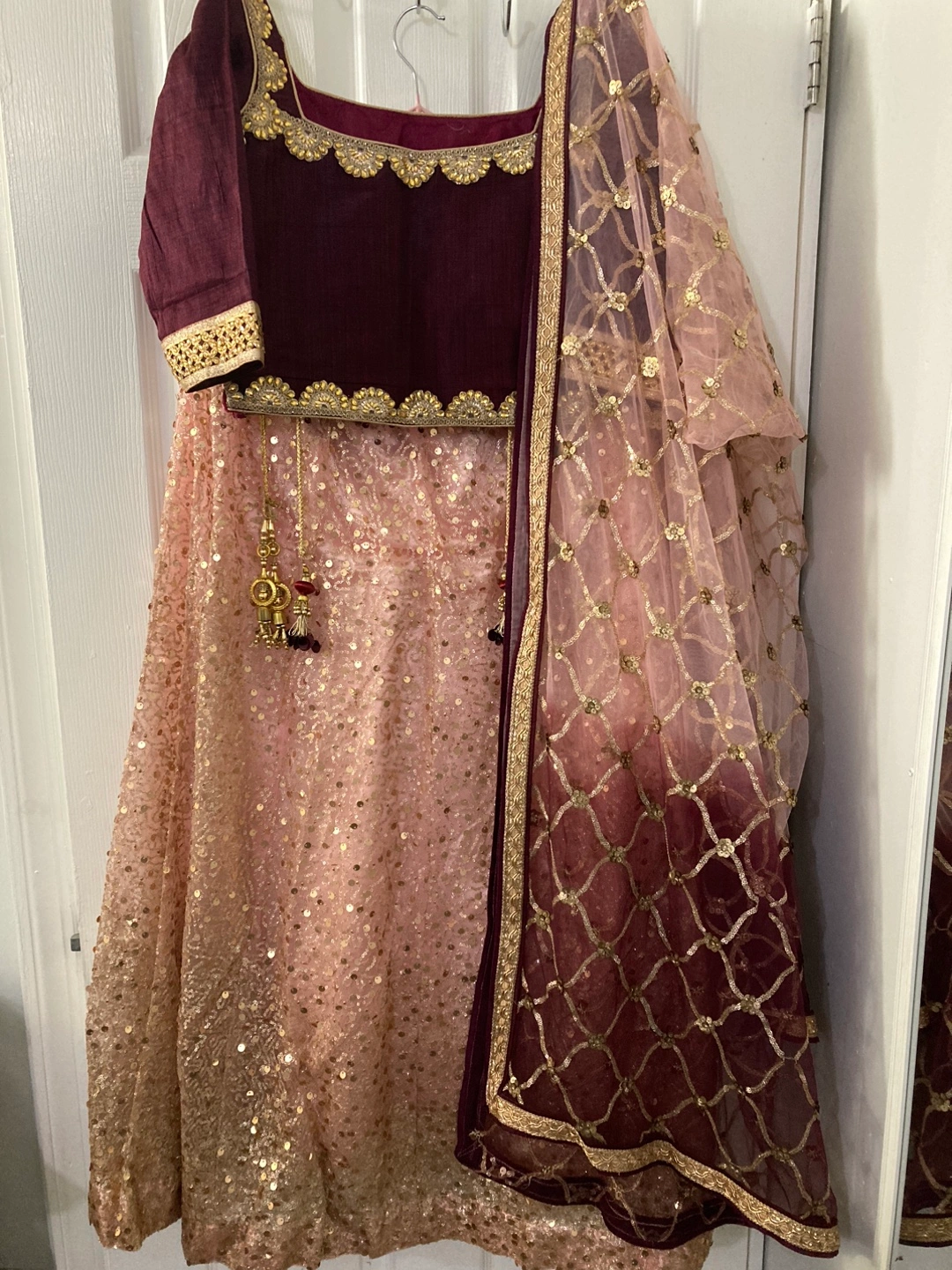 Beautiful lengha with a burgundy top and a pink sequined skirt. The outfit is adorned with gold detailing. Perfect for a special occasion!