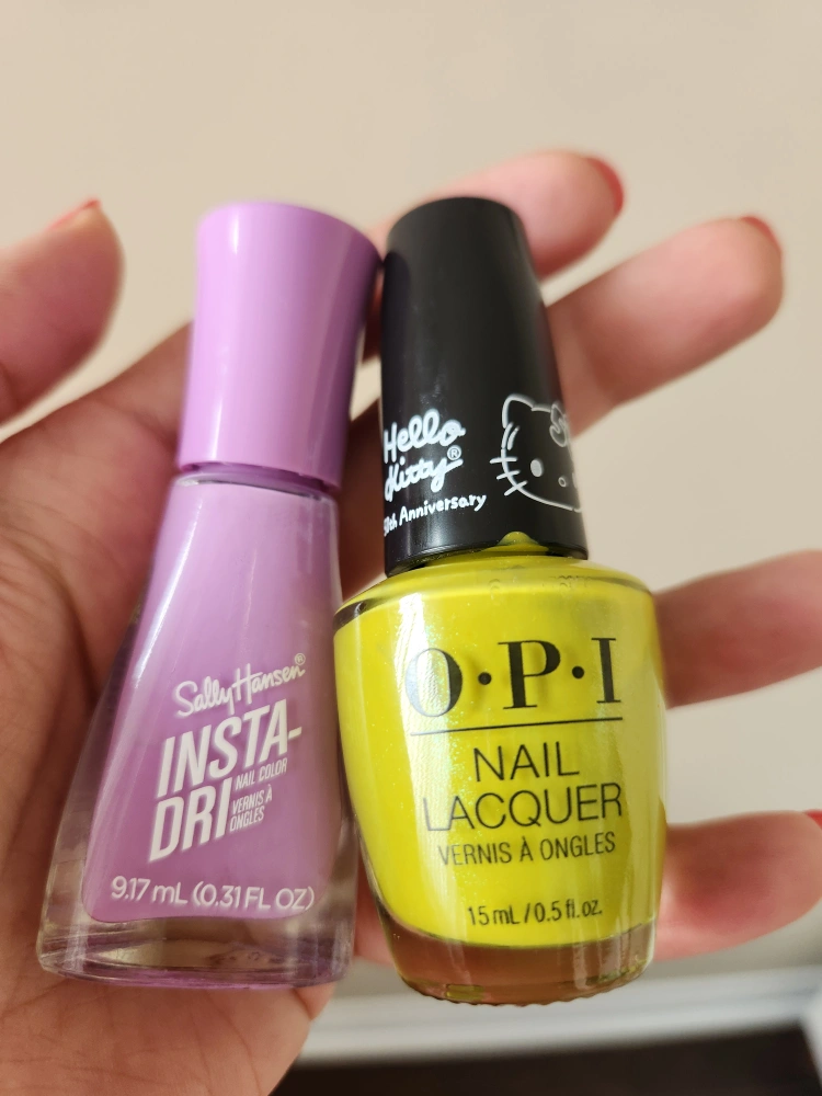 Selling a set of two nail polishes! One is an OPI nail lacquer in lime green and the other is a Sally Hansen Insta-Dri nail colour in a lovely lilac shade.