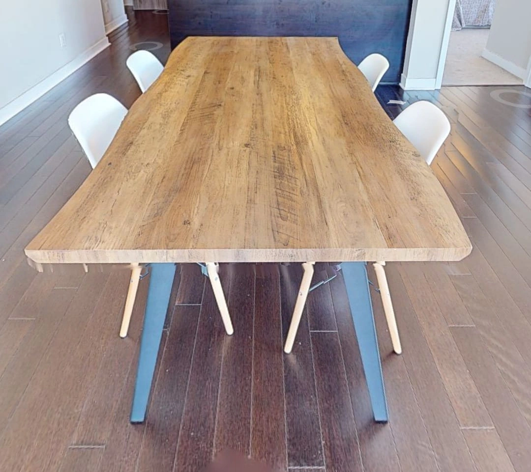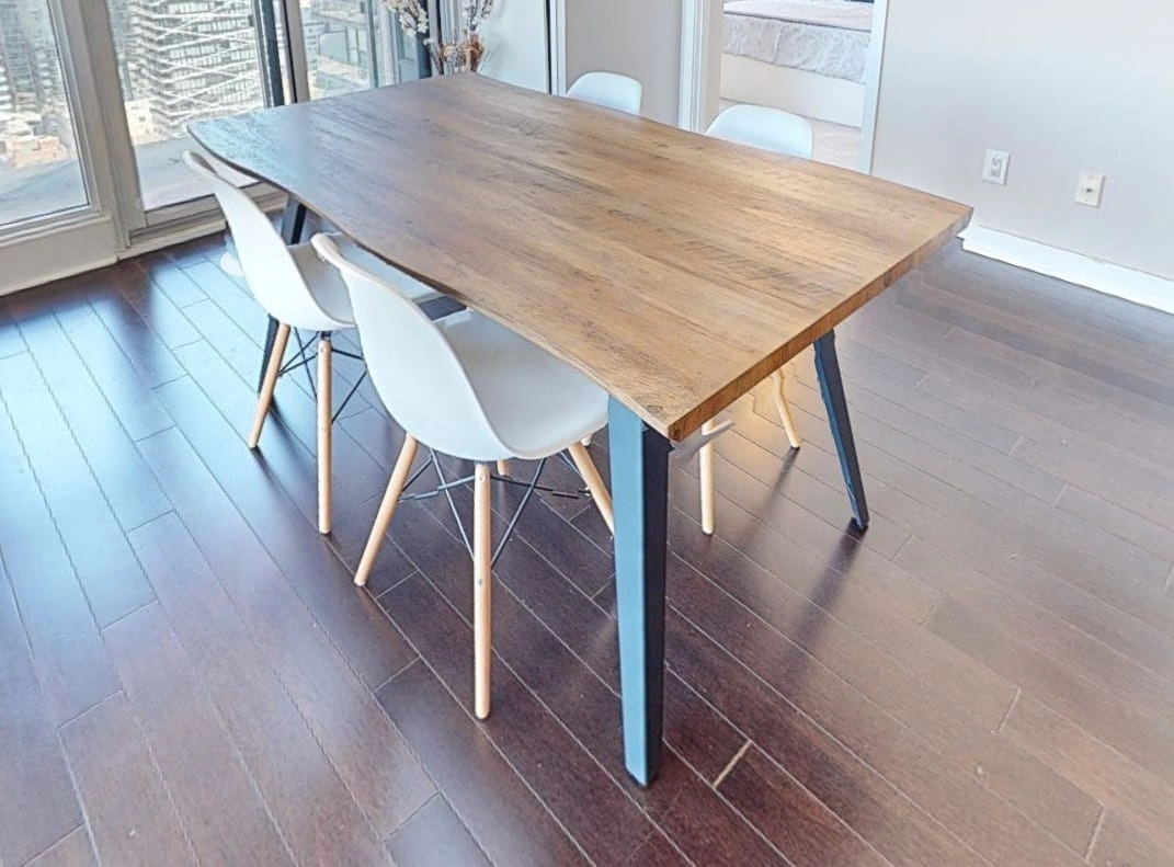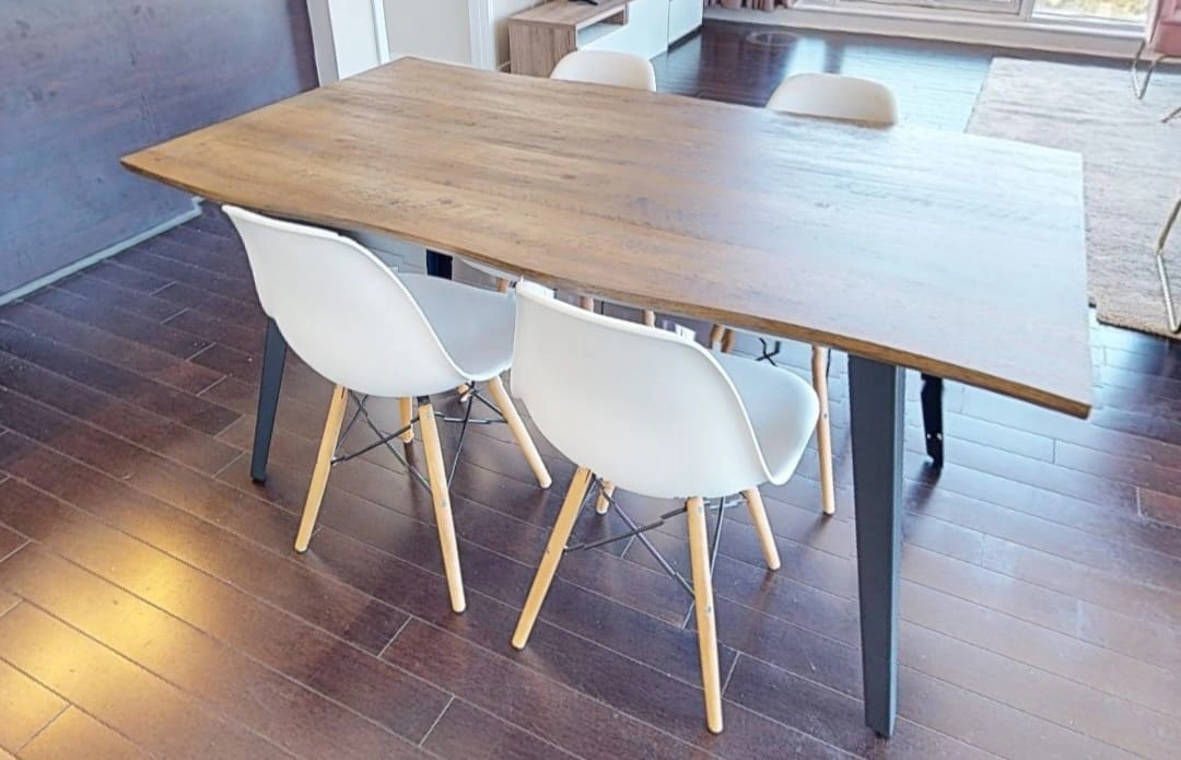 Selling a lovely dining table, perfect for family dinners or gatherings with friends. The table features a beautiful wood grain and sturdy legs. It comes with four modern-style chairs with white seats and wooden legs. A great addition to any dining space!