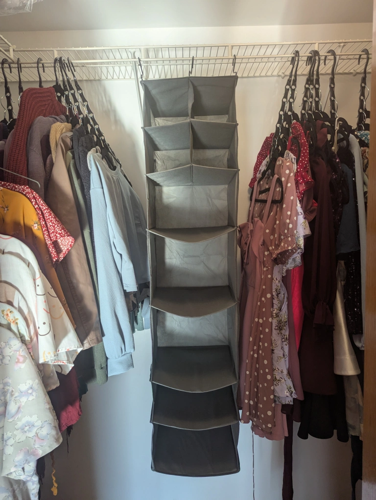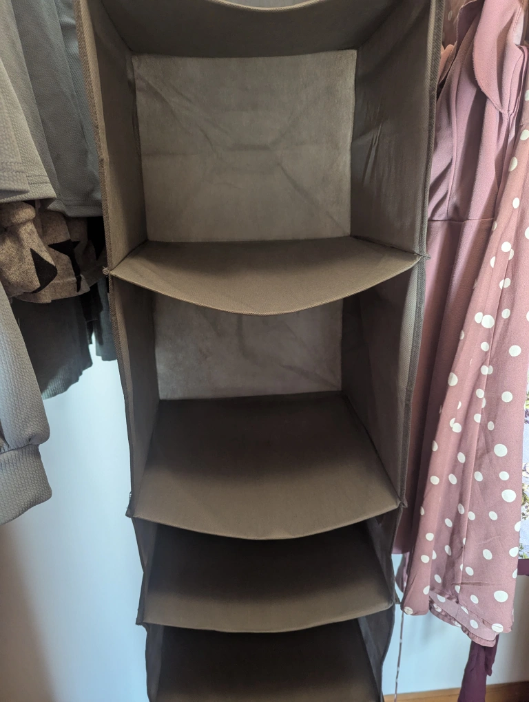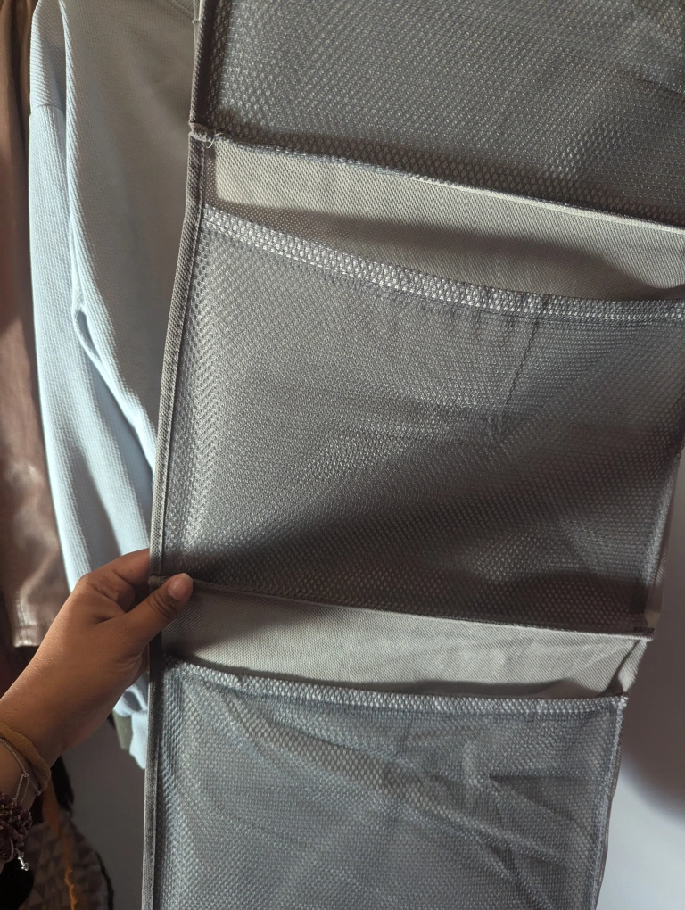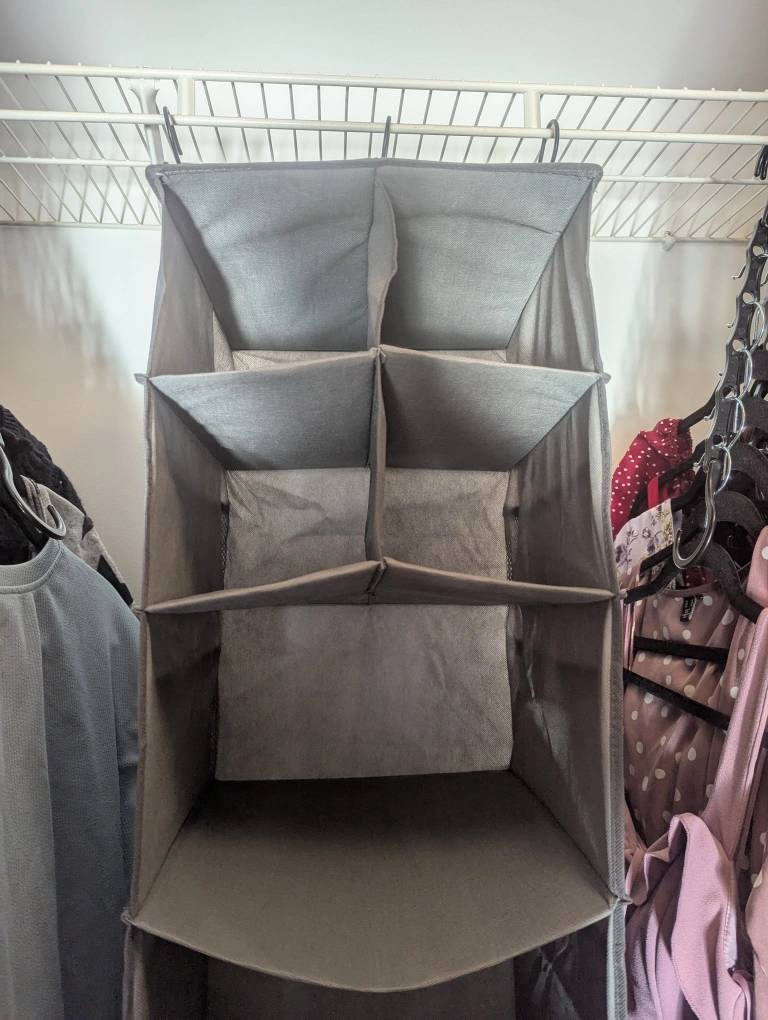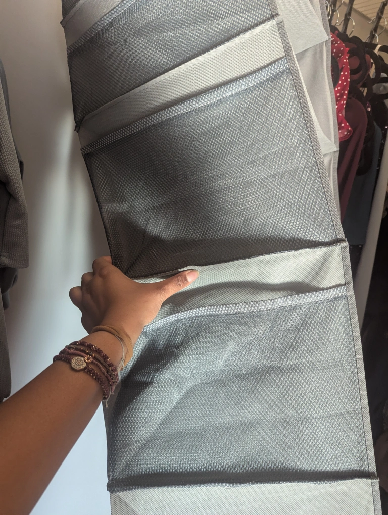 Keep your closet tidy with this gray hanging organizer! It features multiple compartments on the interior and mesh pockets on both sides, perfect for storing clothes, accessories, or anything else you need to keep organized. Held almost the entirety of my winter wardrobe but I no longer need it! Pickup in Uptown.