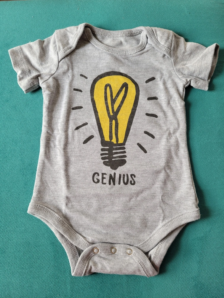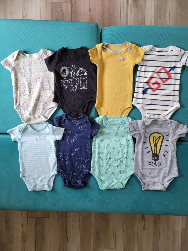 Here's a set of eight baby bodysuits, size 3M! They're in good condition and some never worn and feature cute designs like cars, animals, and a lightbulb. All together for price.
