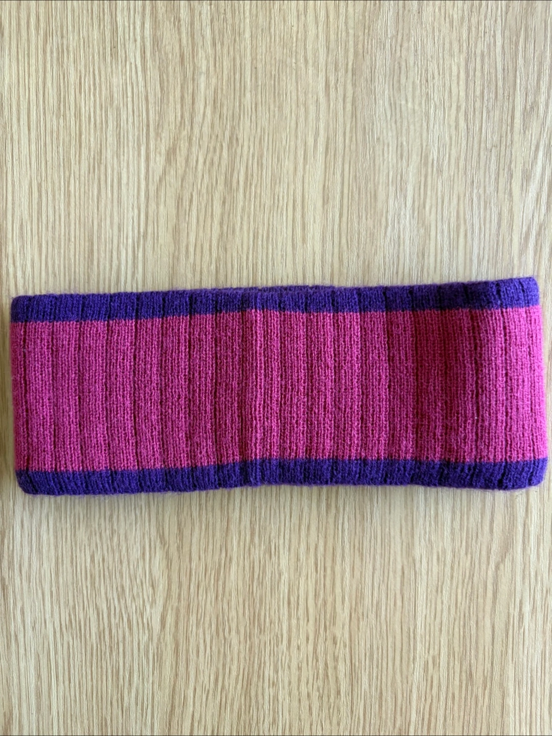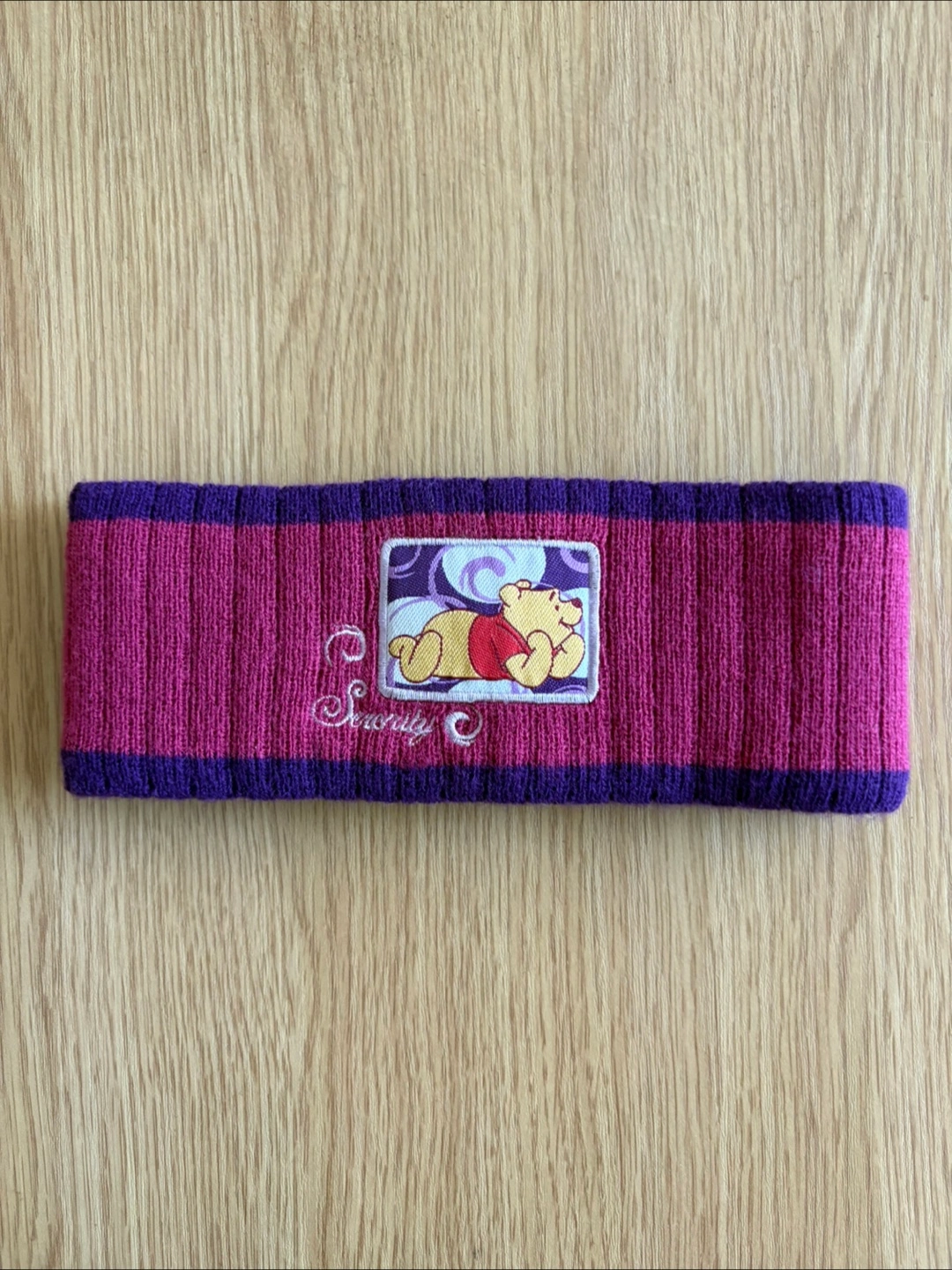 Here's a cute Winnie the Pooh headband. It's pink and purple and features Pooh taking a nap. Perfect for keeping warm and your hair back. It’s in great condition.