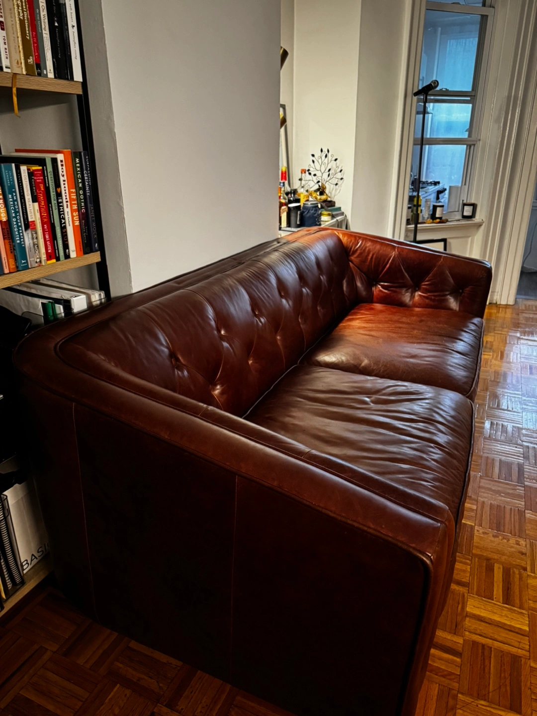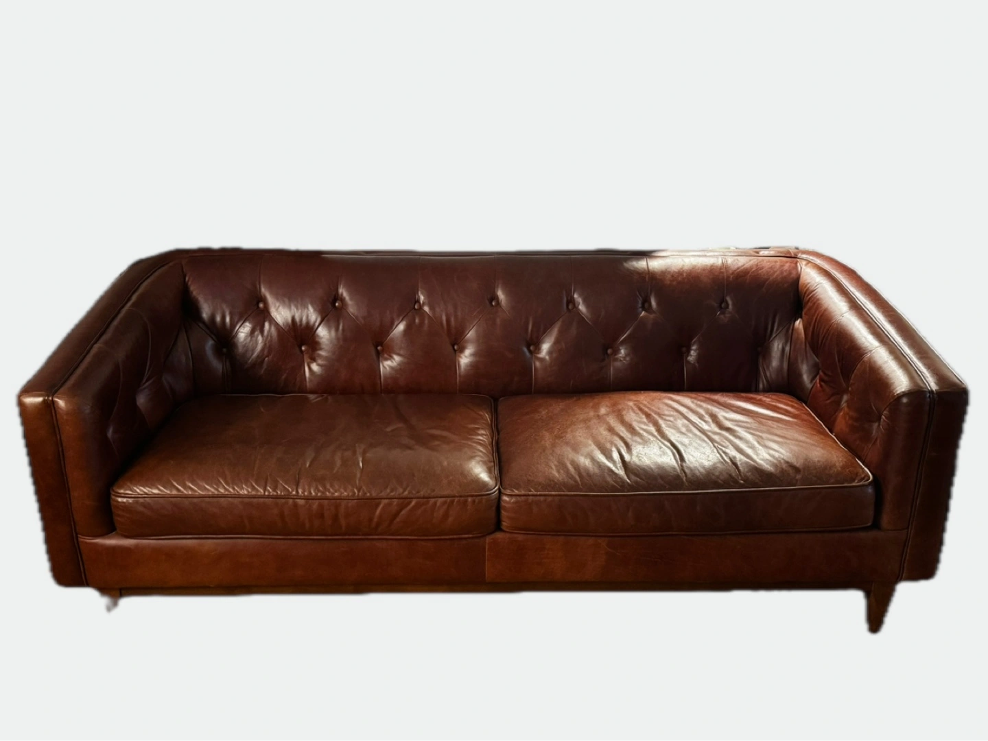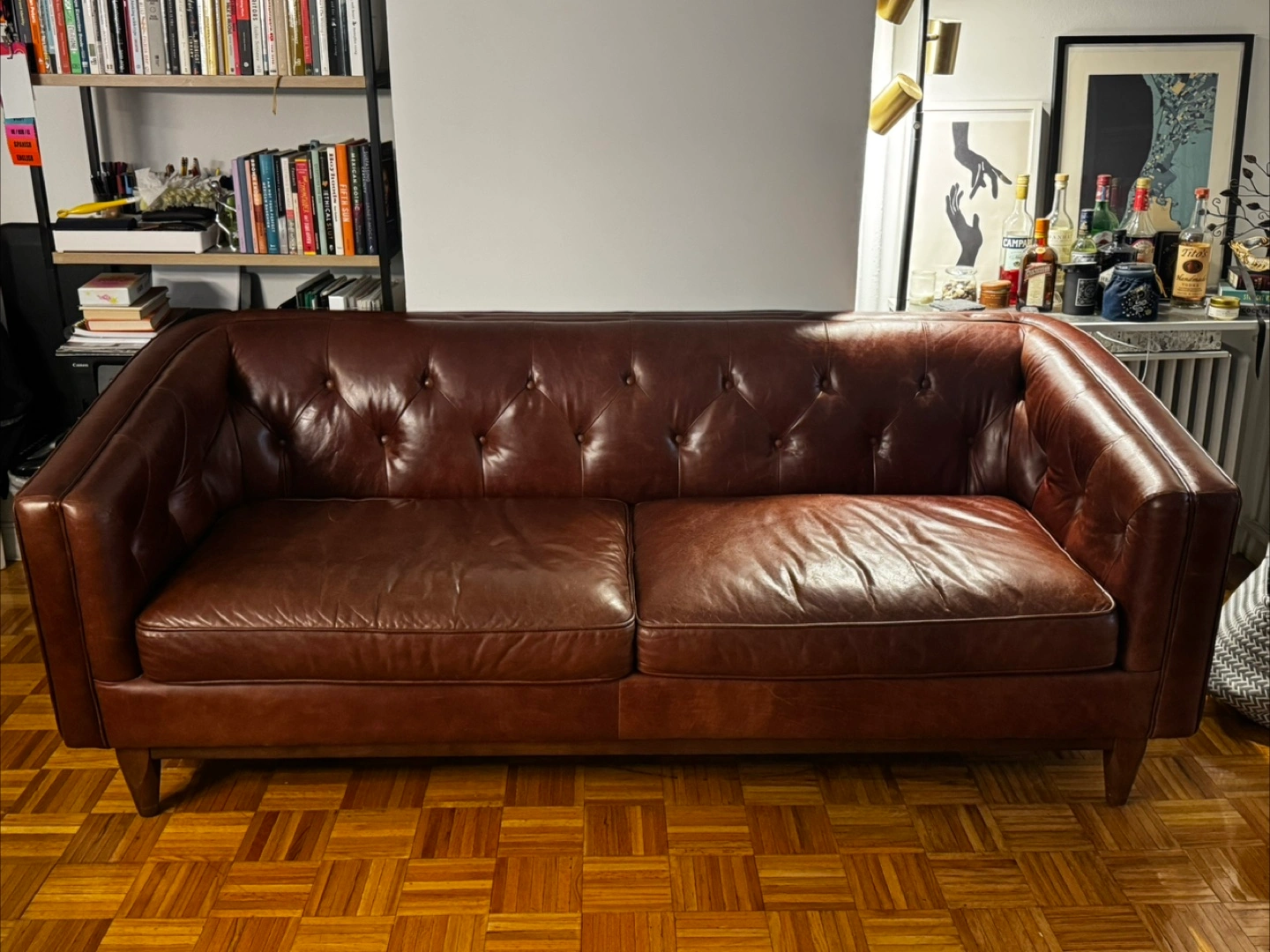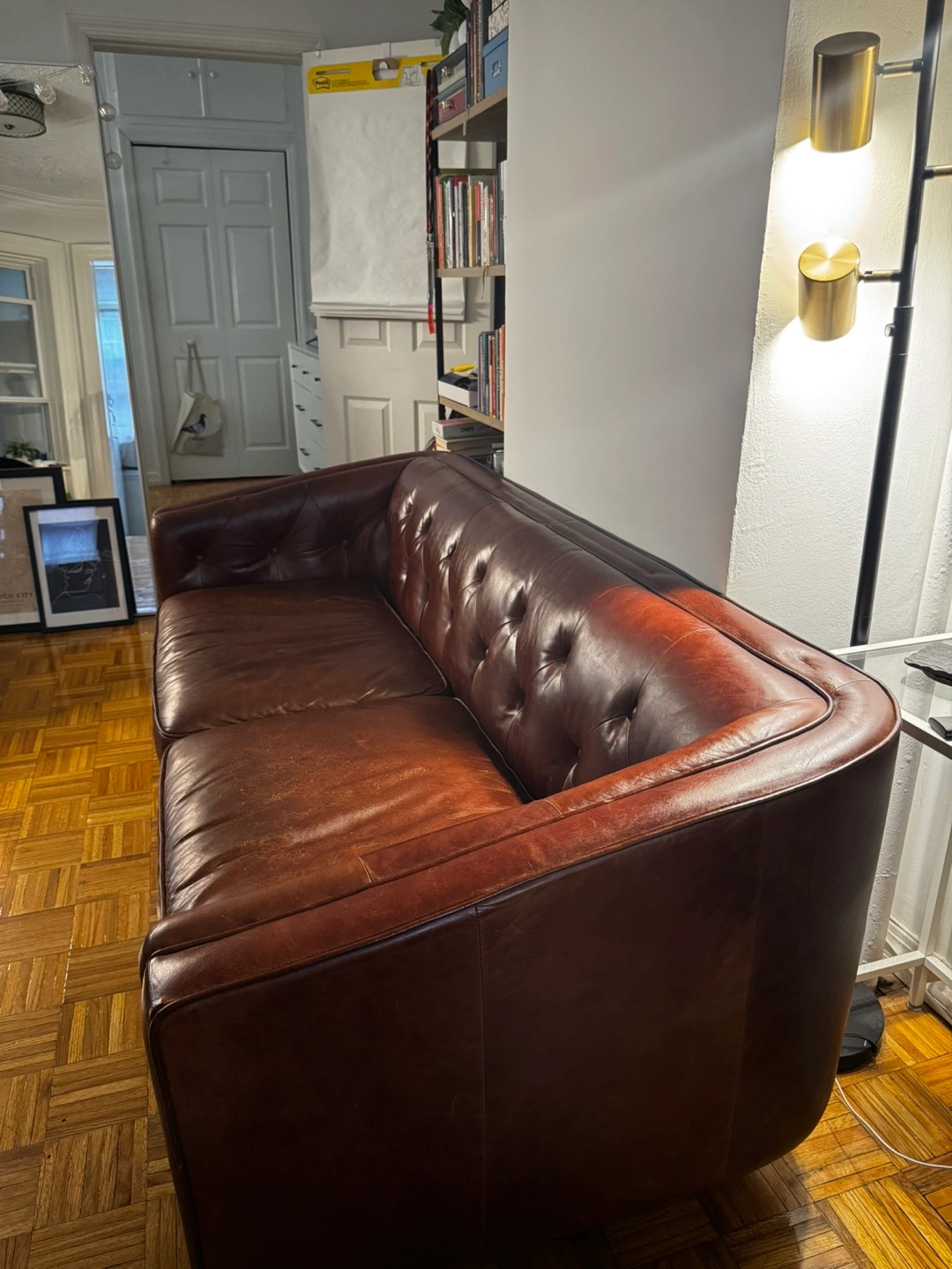 Selling a comfortable brown tufted leather sofa from Article! Originally costed $1800. It's a beautiful piece that would look great in any living room!