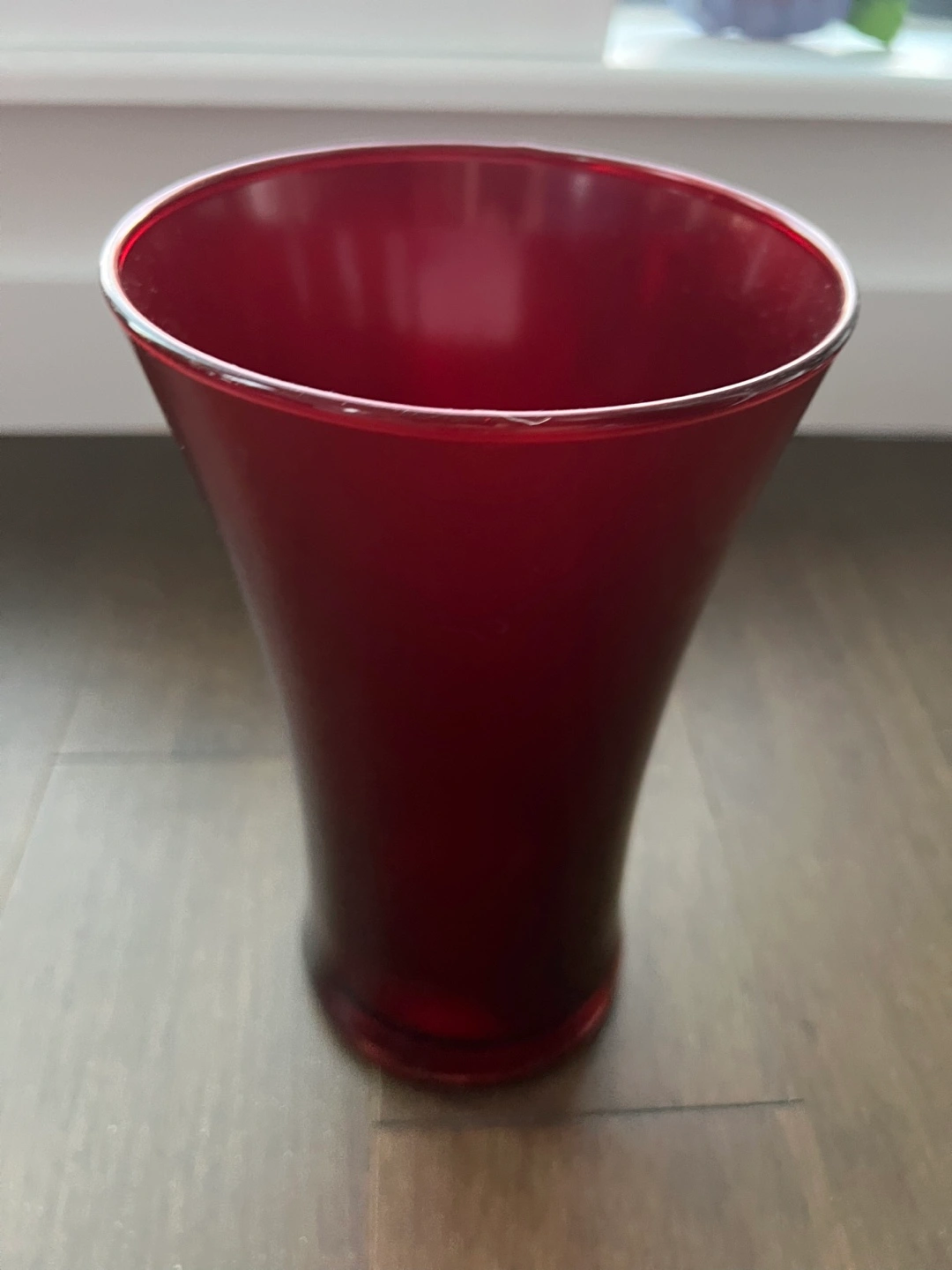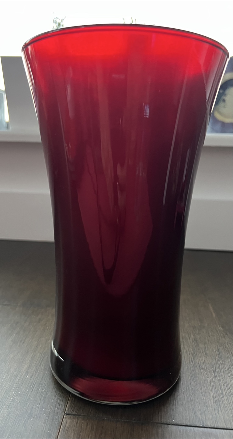 Selling a beautiful red glass vase! It's in great condition and ready to hold your favorite flowers or stand alone as a decorative piece.