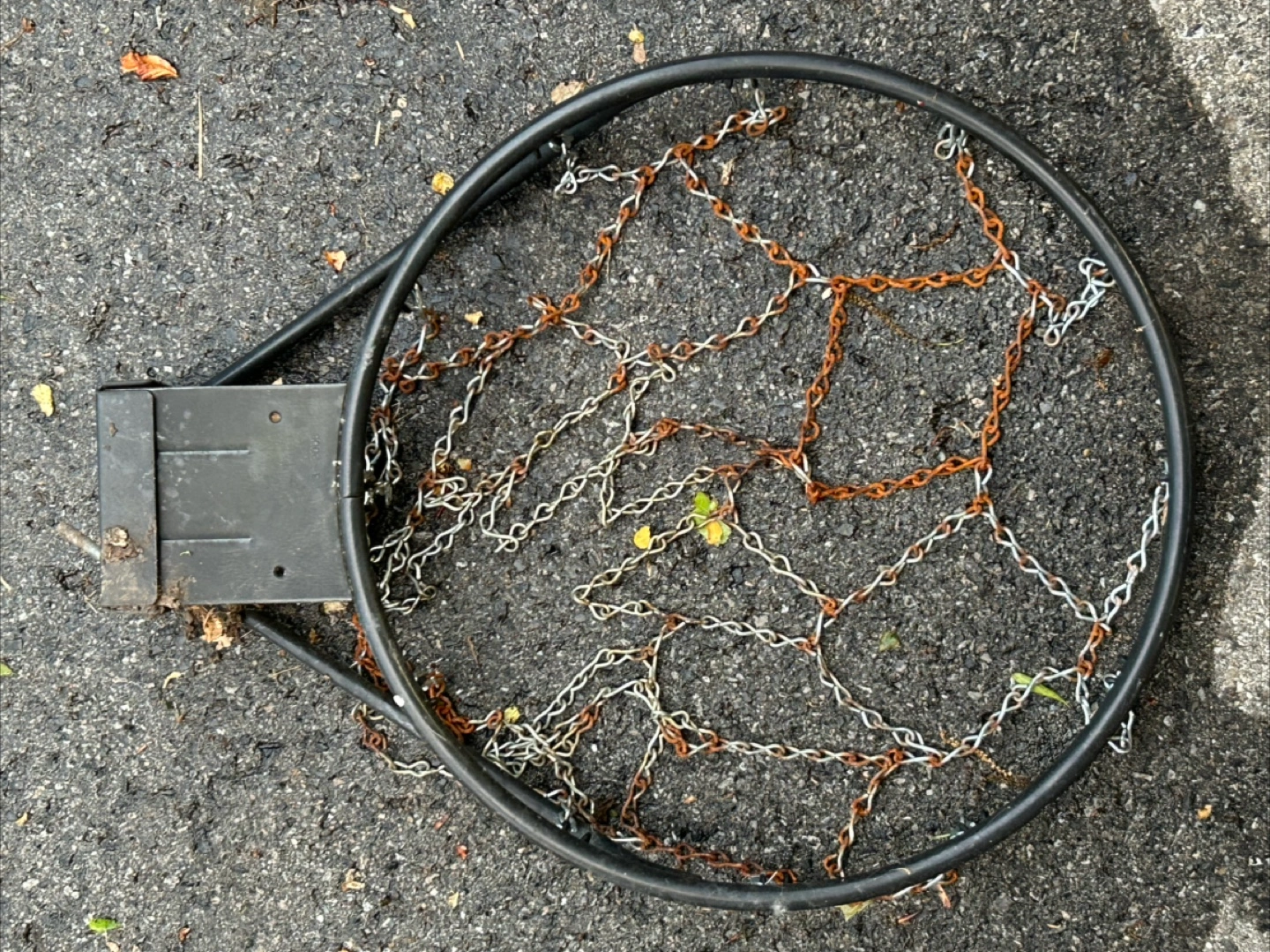 Selling a used basketball rim with a chain net. The rim is black and the net is made of metal chains. Some of the chains show signs of rust. It's a bit worn, but still functional for some backyard hoops