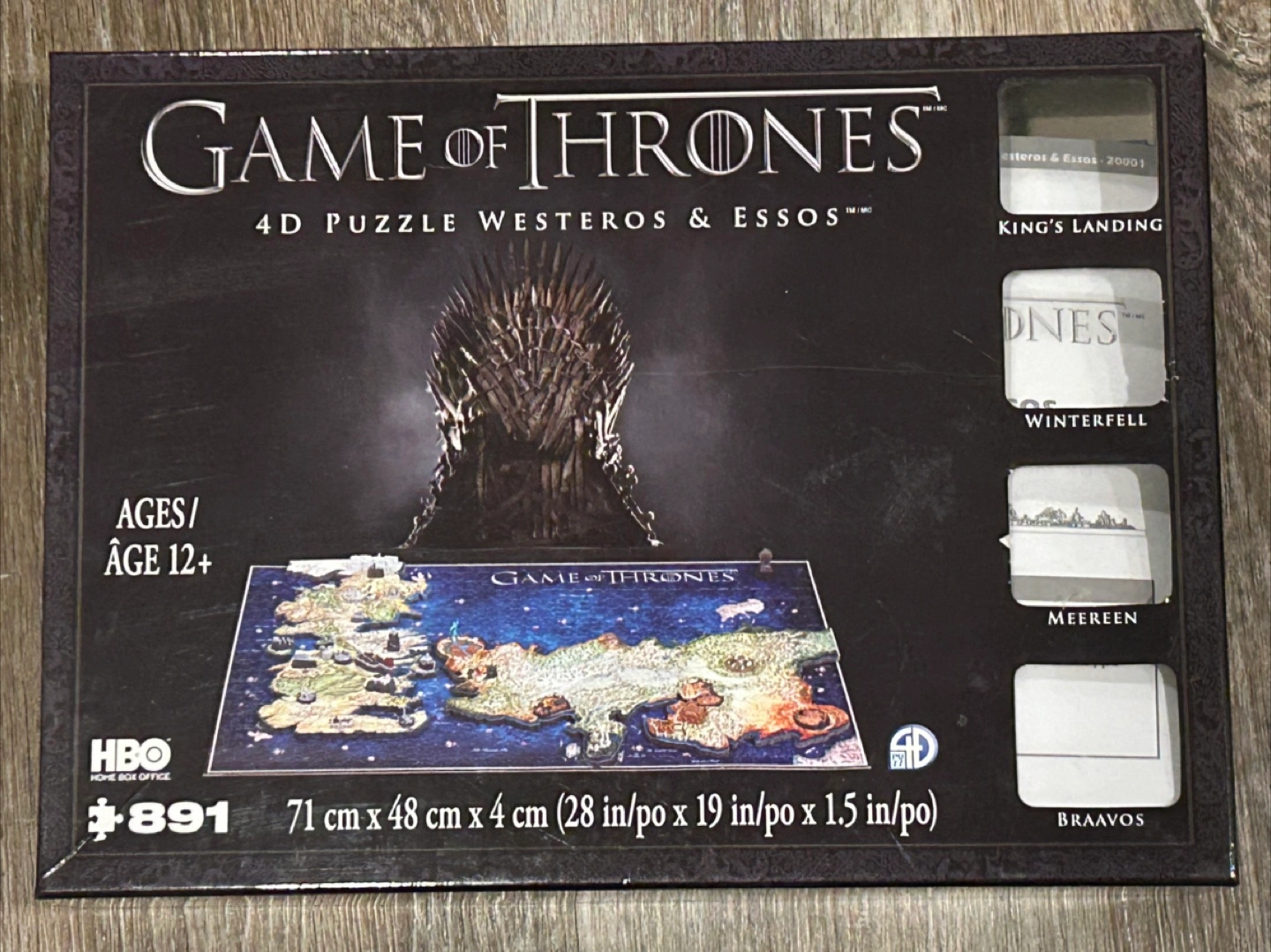 Selling a Game of Thrones 4D Puzzle of Westeros & Essos! It's suitable for ages 12+. The box dimensions are 71 cm x 48 cm x 4 cm (28 in x 19 in x 1.5 in). Perfect for any Game of Thrones fan!