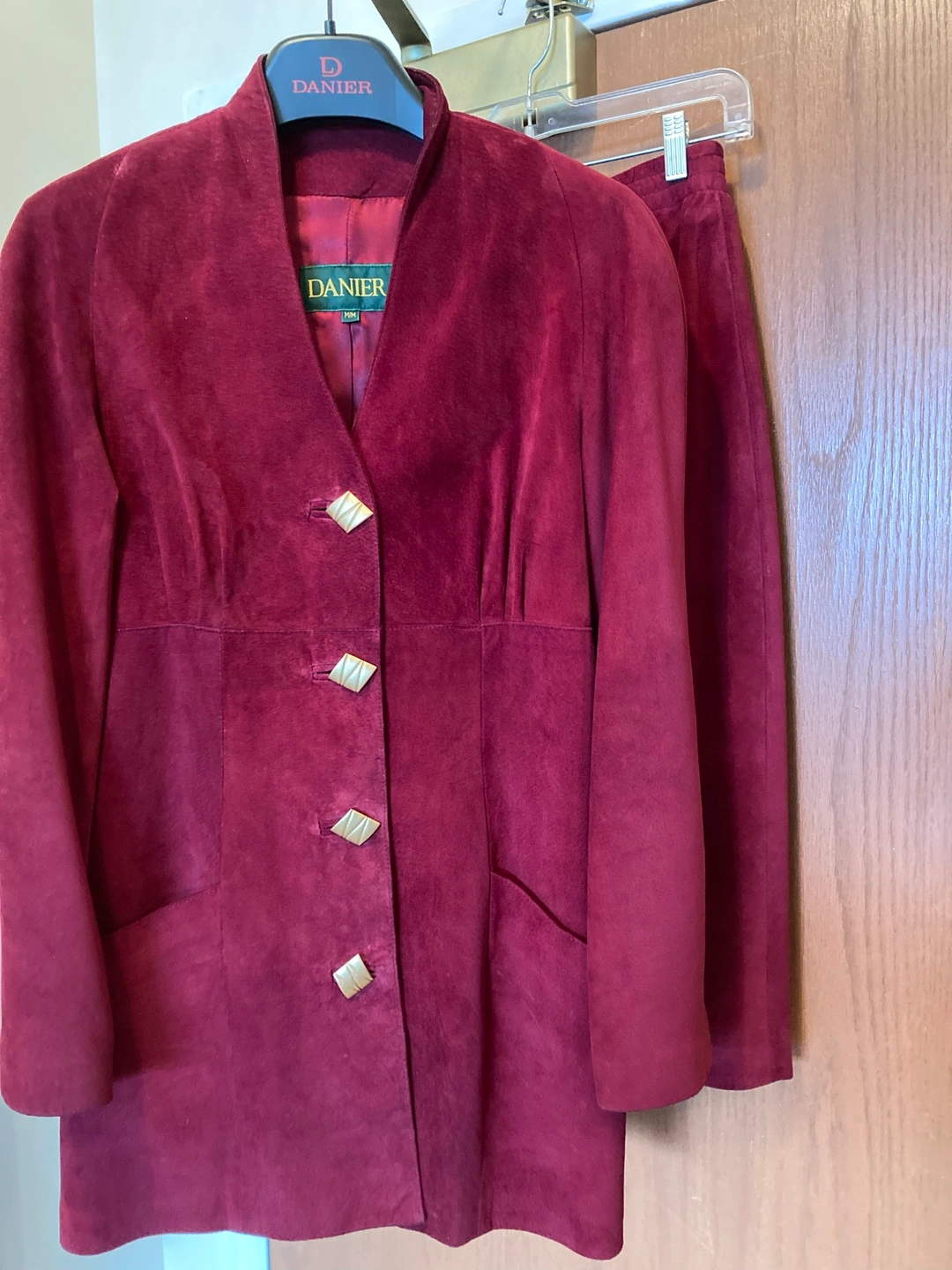 Classy elegant gorgeous bright cranberry color Danier skirt suit. The suit is made of soft suede and includes a jacket and skirt. The size is M. Excellent condition. I couldn’t wear it way too big for me. It certainly stands out and turns heads.