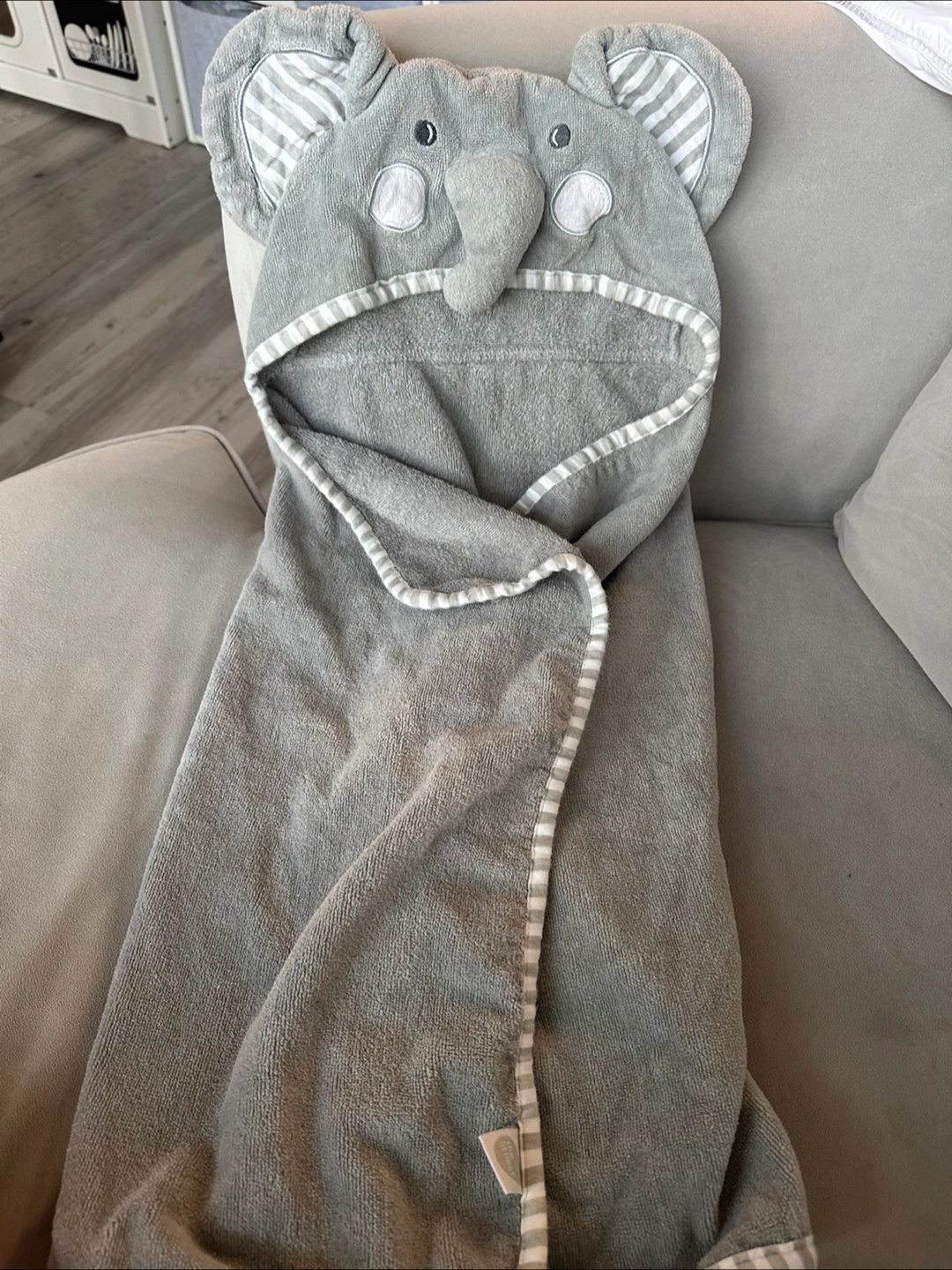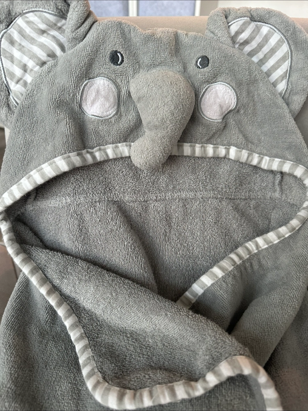 Here's a super cute hooded baby towel. It's designed like an elephant, perfect for bath time fun! The towel is soft and cozy, great for keeping your little one warm and dry after a bath.