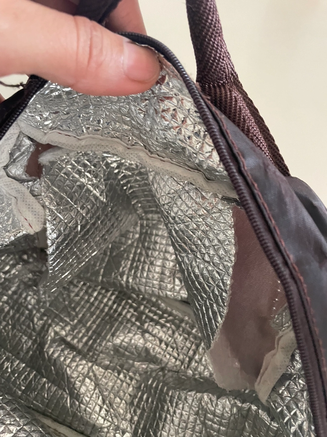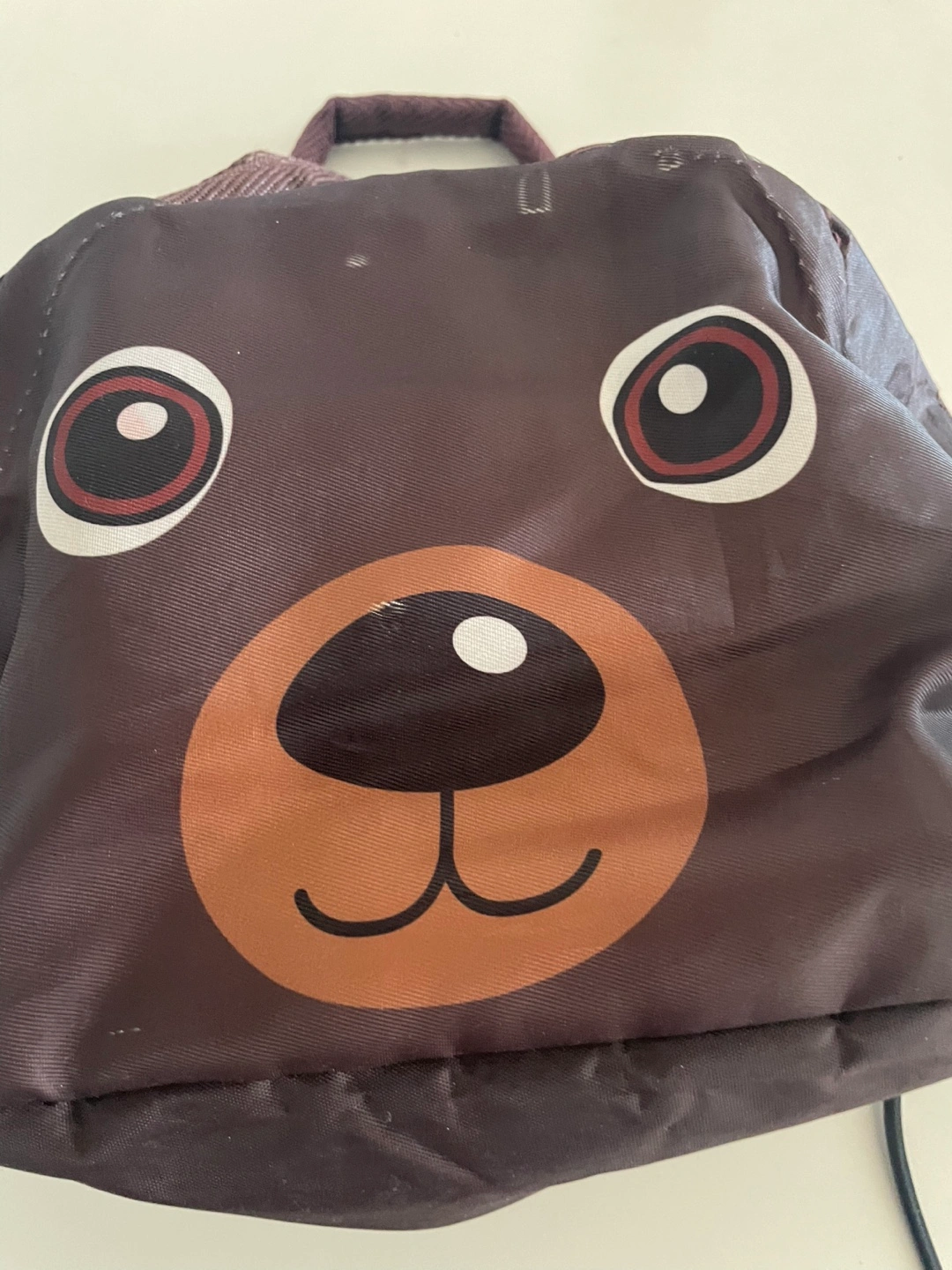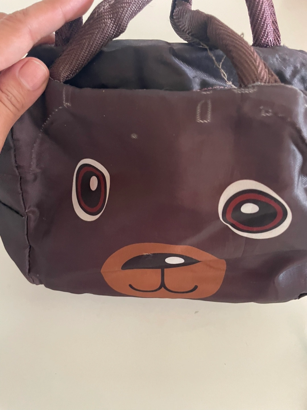 Here's a cute lunch bag with a brown bear design! It has a zipper closure and carrying handles. The inside is insulated to help keep your food at the right temperature