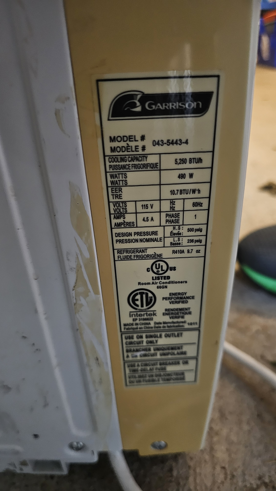Selling a Garrison window air conditioner. It has a cooling capacity of 5,250 BTU/h and uses 490W. It operates at 115V and 60Hz. The refrigerant is R410A 9.7 oz. Model # is 043-5443-4