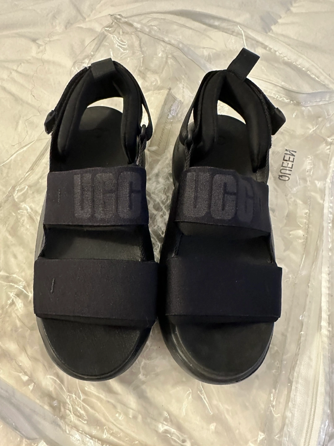 Selling a pair of UGG black sandals in size 8..They're super comfortable and in great condition. The sandals feature the UGG logo on the straps. Perfect for a casual day out! Small puppy teeth marks on strap but hardly noticeable otherwise on great condition! Pick up only East 106and 1st ave