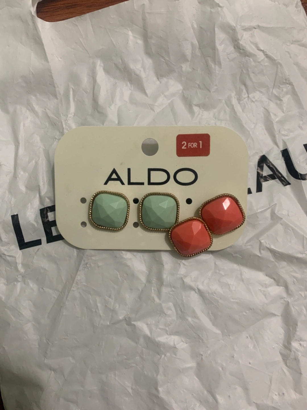 Cute set of Aldo stud earrings, still on the original card! You get two pairs: one in a soft mint green and the other in a coral colour. Originally bought for $12