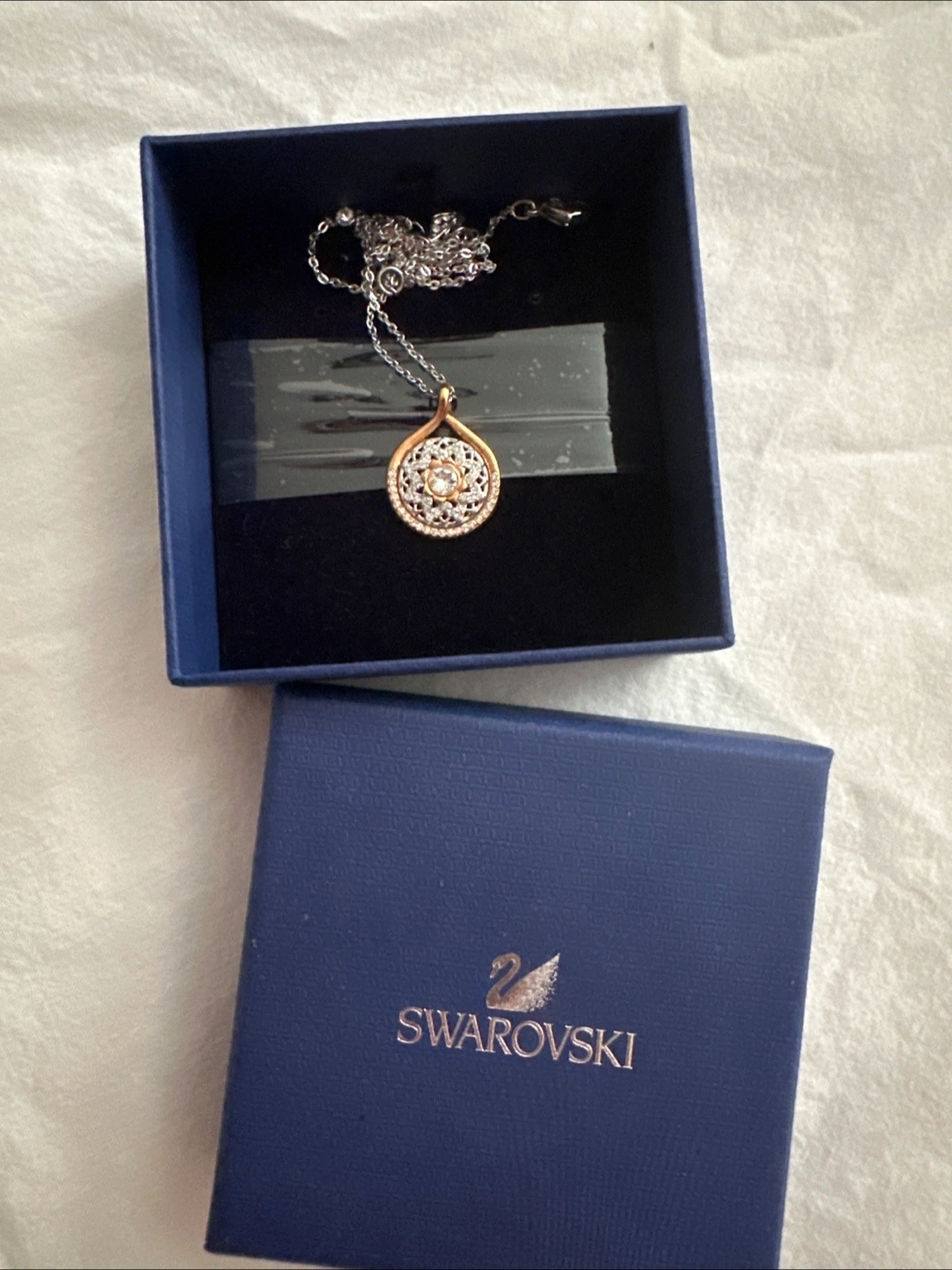 Selling a beautiful Swarovski pendant necklace. It comes with its original box, perfect for gifting or safekeeping! The pendant has a lovely intricate design.