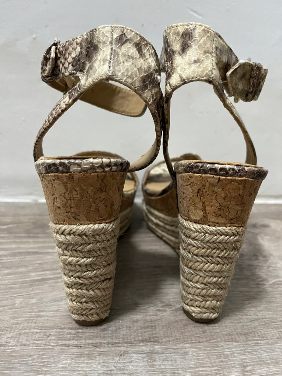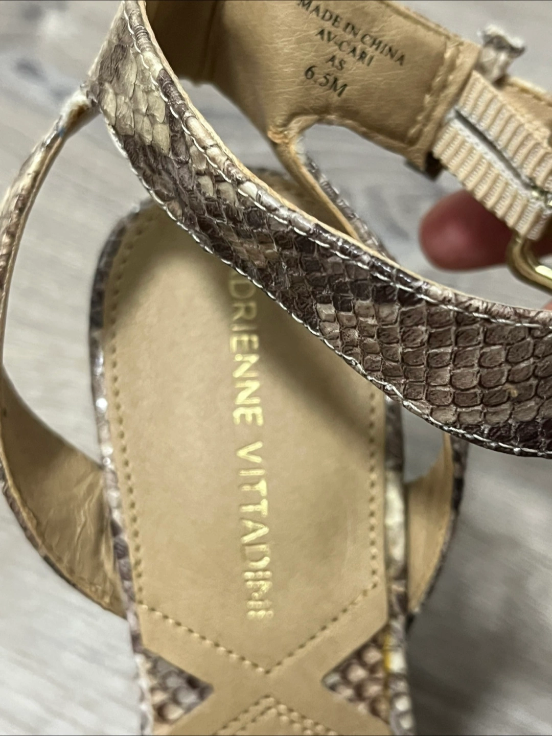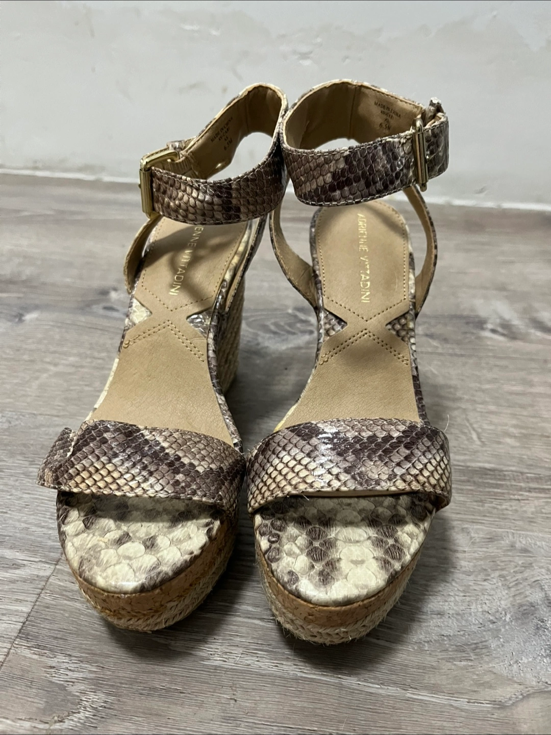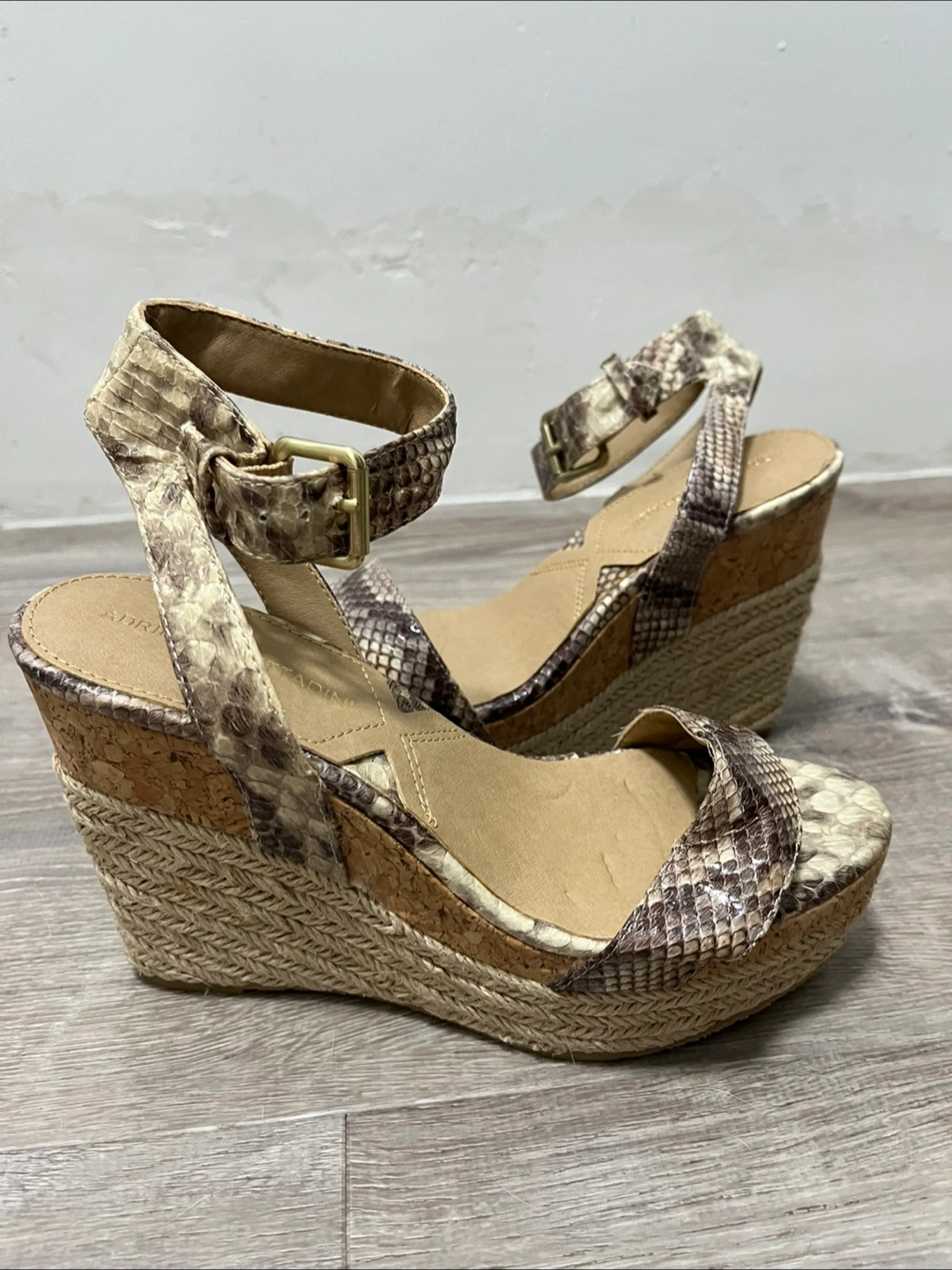 Selling a pair of Adrienne Vittadini AV-CARI wedge sandals in size 6.5M. They feature a unique snakeskin print and a stylish 41/2 inch wedge heel. Never worn