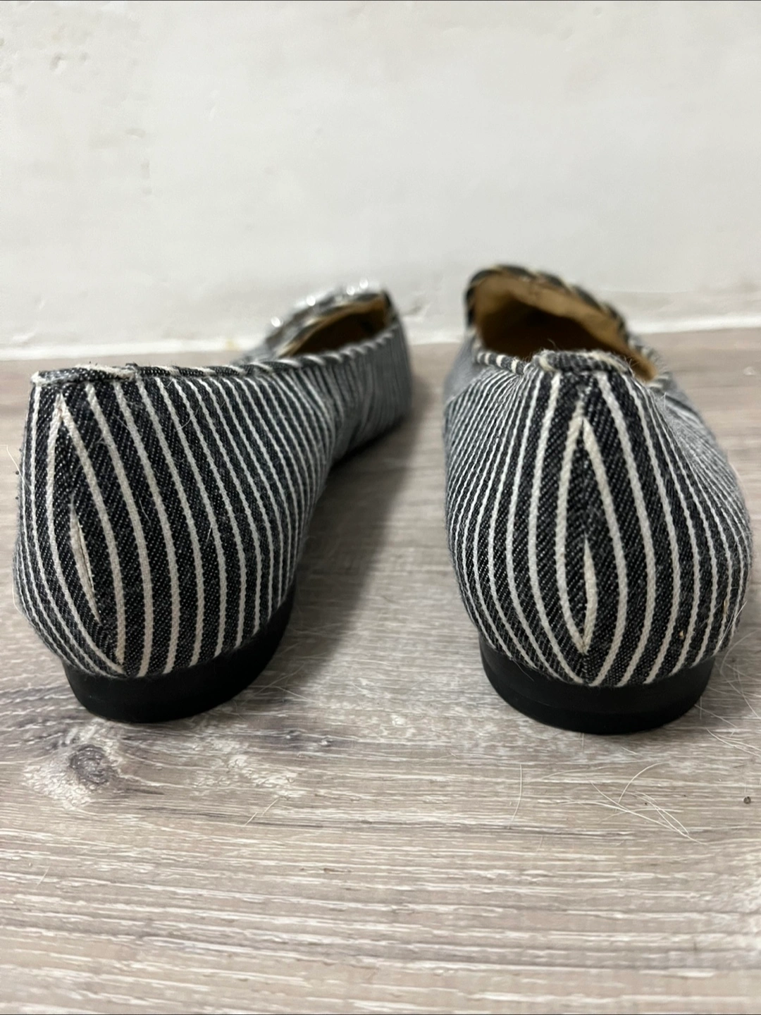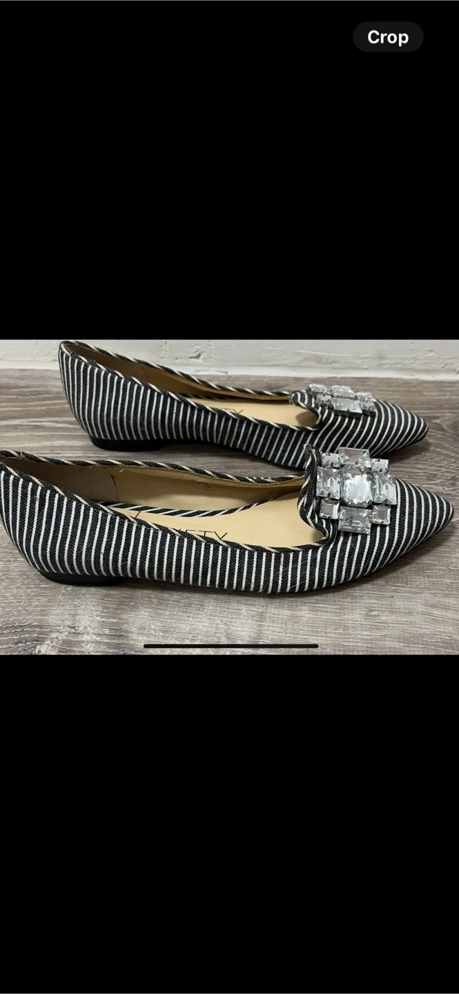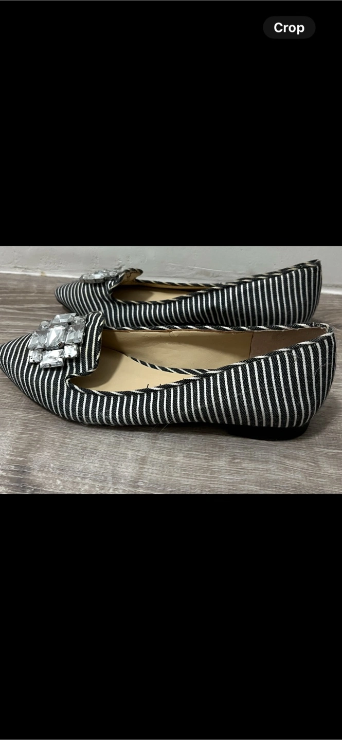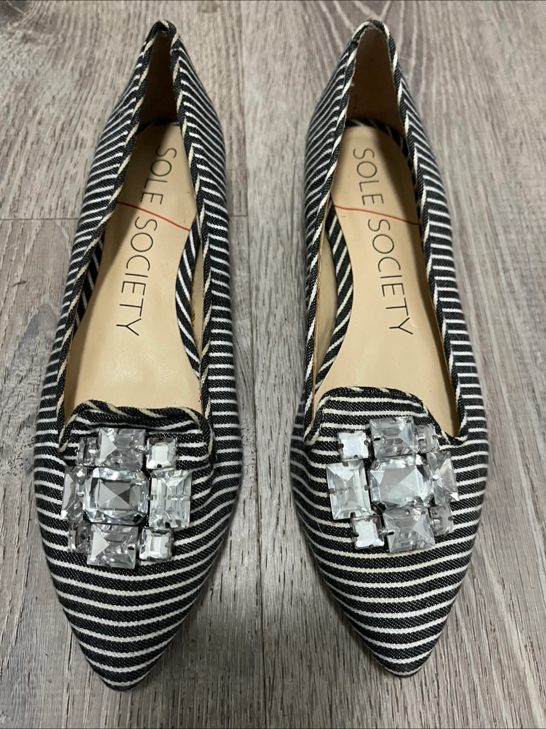 Cute Sole Society flats with a black and white striped pattern and a jeweled embellishment. Size 6.5. Never worn.