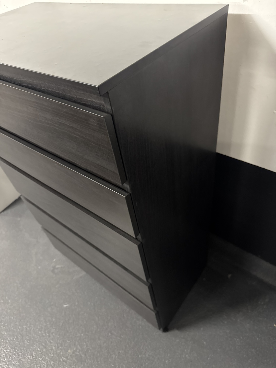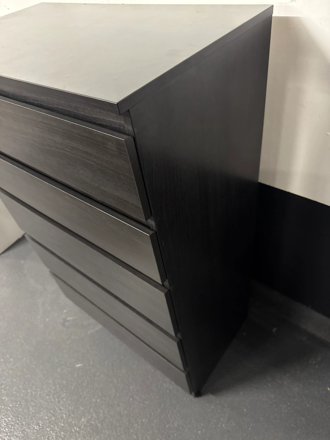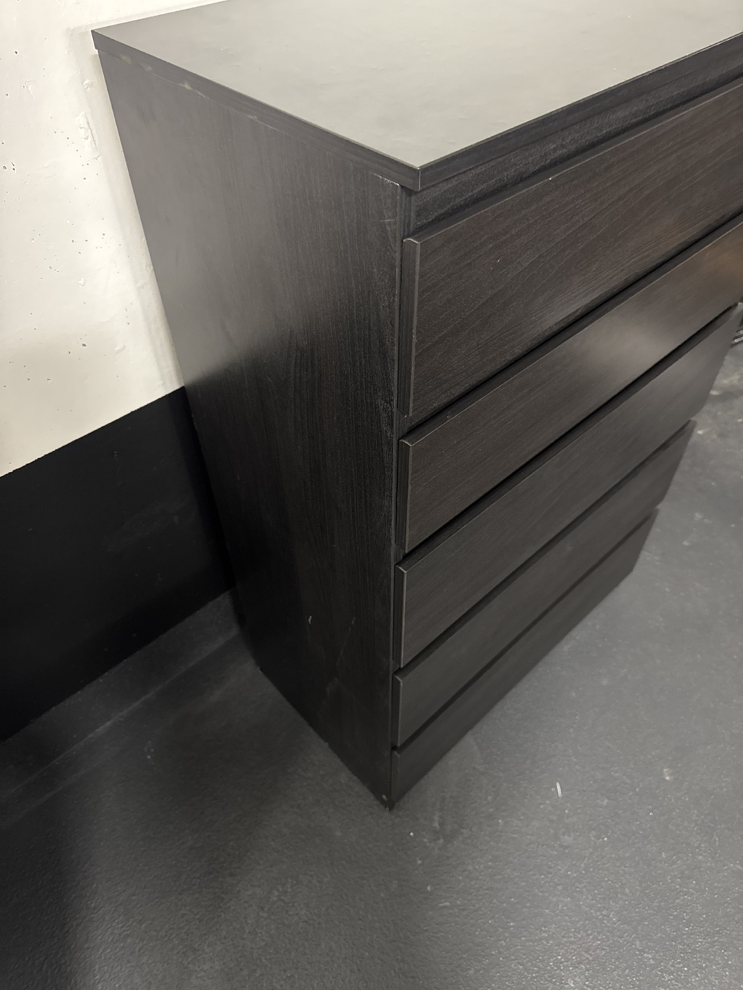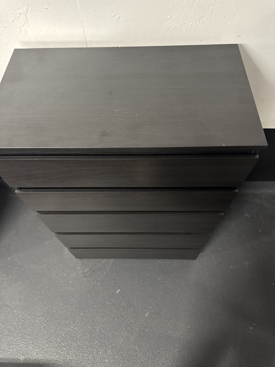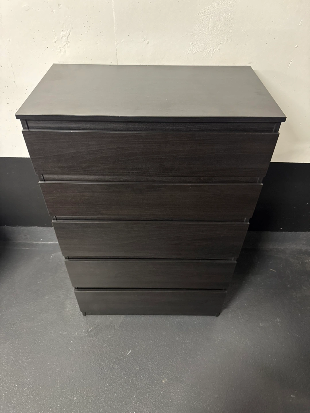 Selling a used IKEA Malm dresser with 5 drawers. It's in good condition and perfect for adding storage to any room. The dresser is a dark brown colour.