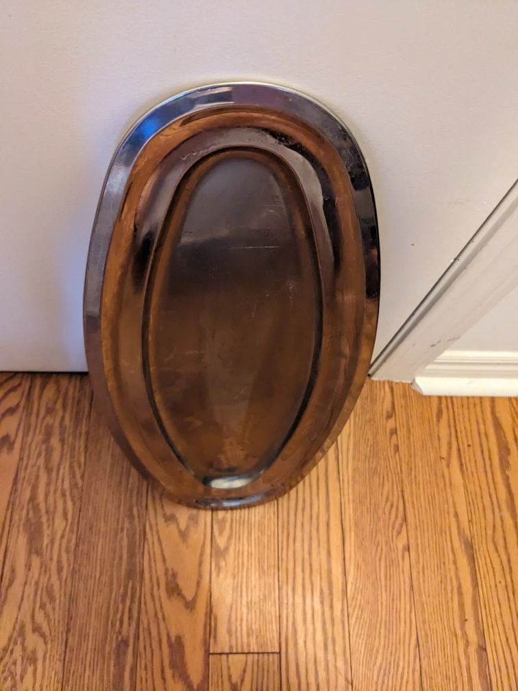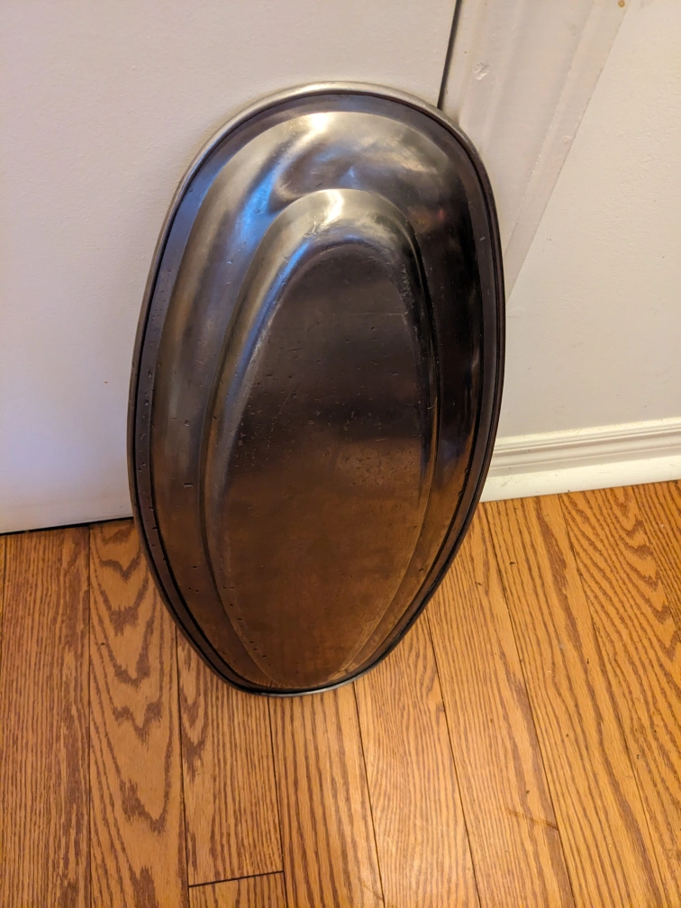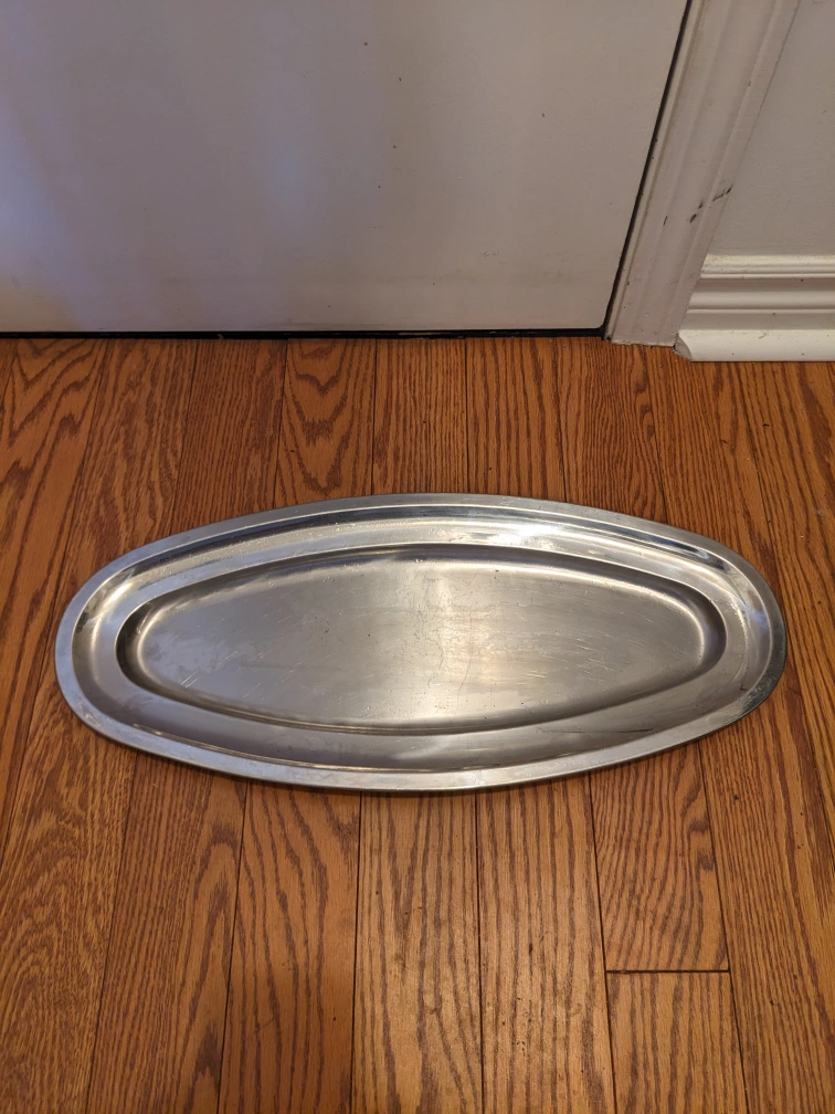Selling a used oval serving tray. It has a simple design and would be perfect for serving appetizers or drinks. It's in decent condition with some signs of use.