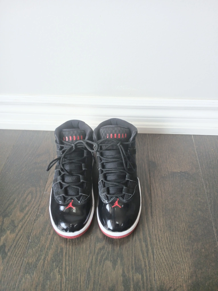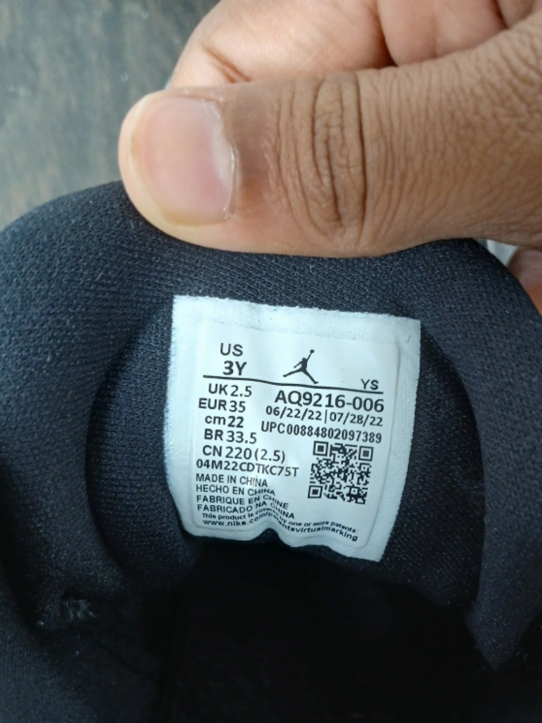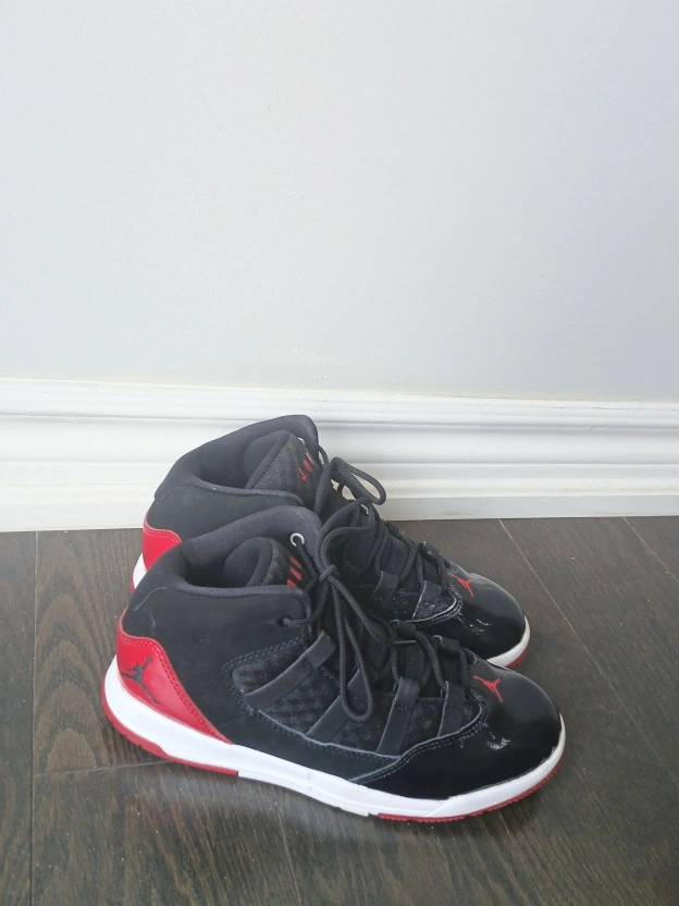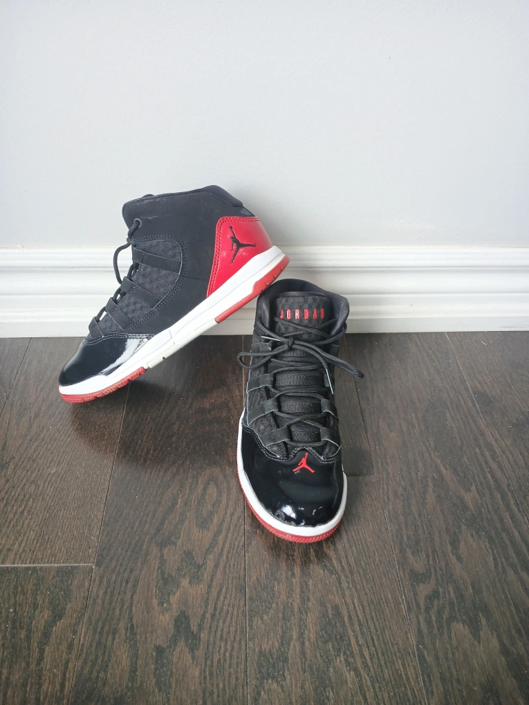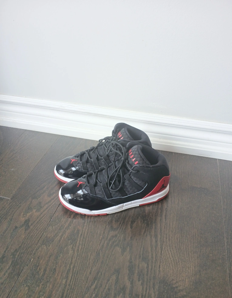 Selling a pair of Nike Air Jordan Max Aura shoes that are in great condition. They feature a black and red colourway. The size is US 3Y, UK 2.5, EUR 35, and CN 220 (2.5). The style code is AQ9216-006. (Price negotiable)