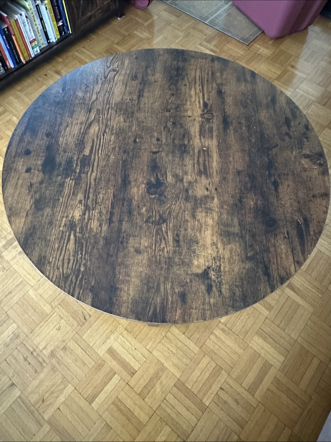 Selling a round coffee table with a wood top and metal legs! It's in great condition and would look lovely in any living room. The dark wood finish is very stylish and the metal legs give it a modern look. It's a sturdy and functional piece