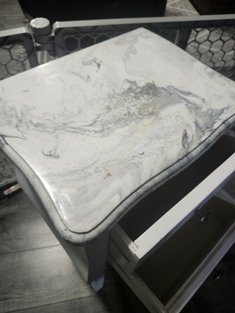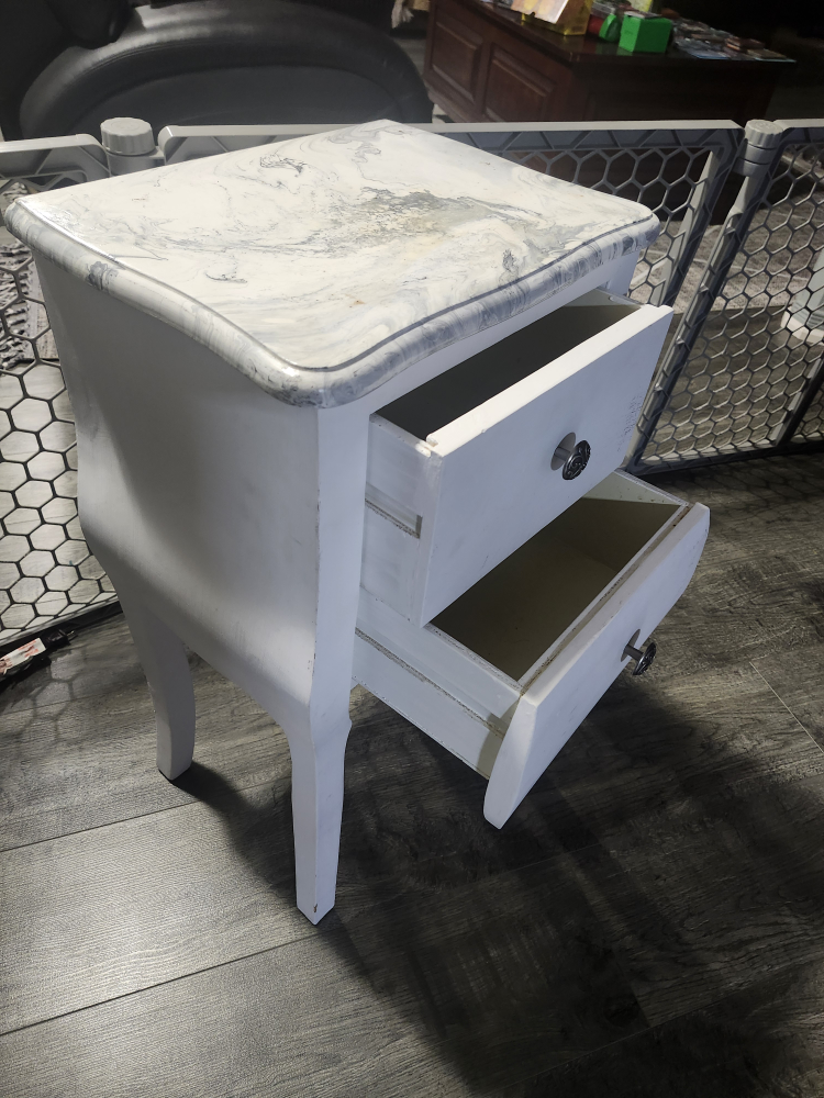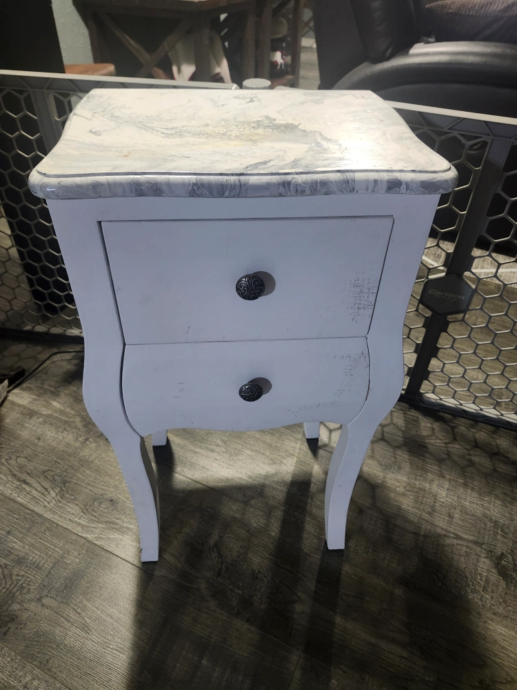 Selling a cute little white side table with a marble-look top! It has two drawers for storage, perfect for a bedside table or small space in your home