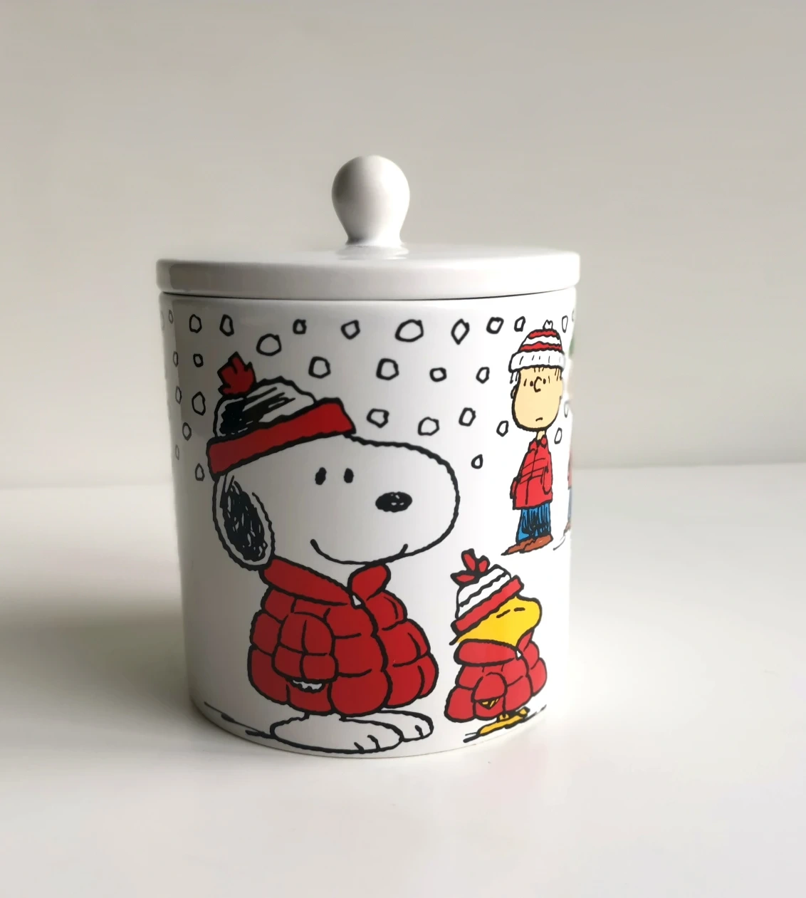 Selling a cute ceramic jar featuring Snoopy and friends in winter outfits! It's a charming piece that would look great in any kitchen or as a decorative item. Great condition and ready for a new home