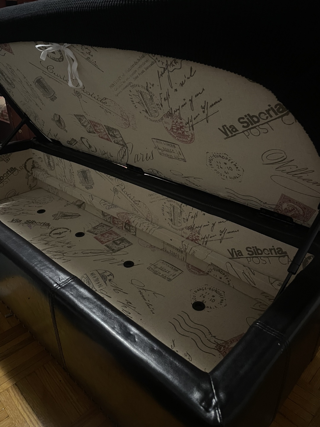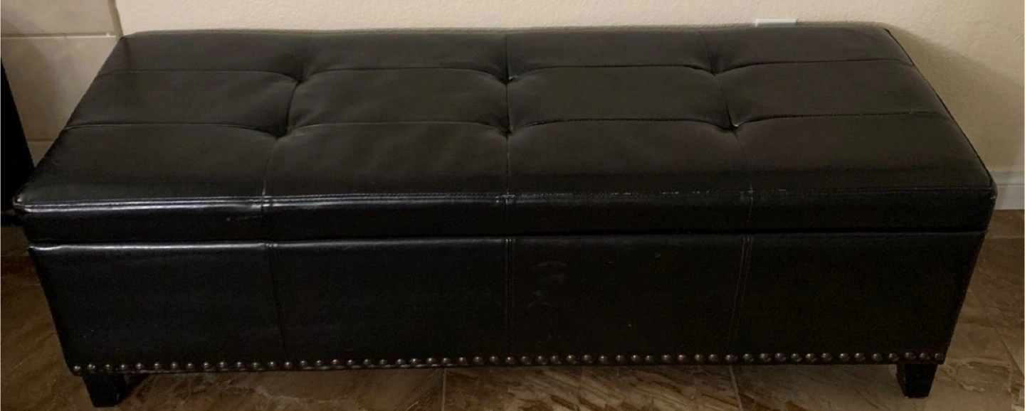 Selling a black storage ottoman bench. It's in good condition and offers a stylish way to store items! It measures approximately 150cm in length, 50cm in width, and 30cm in height. The interior has a decorative lining. The leather is not in the best condition which is why there is a cover on top. The last pic is just a reference photo! If you keep the top cover on you can not tell the leather is chipping at all. Other than that it’s completely fine and very useful!