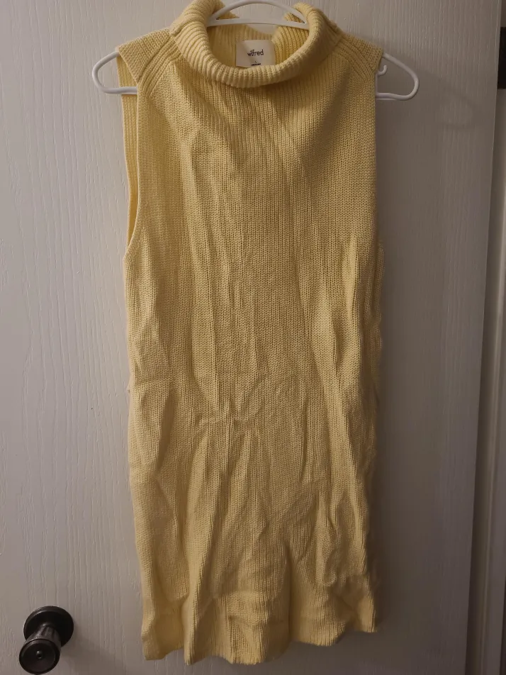 New Wilfred sleeveless knit dress in a soft yellow colour. The body is made of 55% wool and 45% cotton. The rib trim consists of 50% wool, 42% cotton, 7% nylon, and 1% elastane. I remove the tag but never worn it.