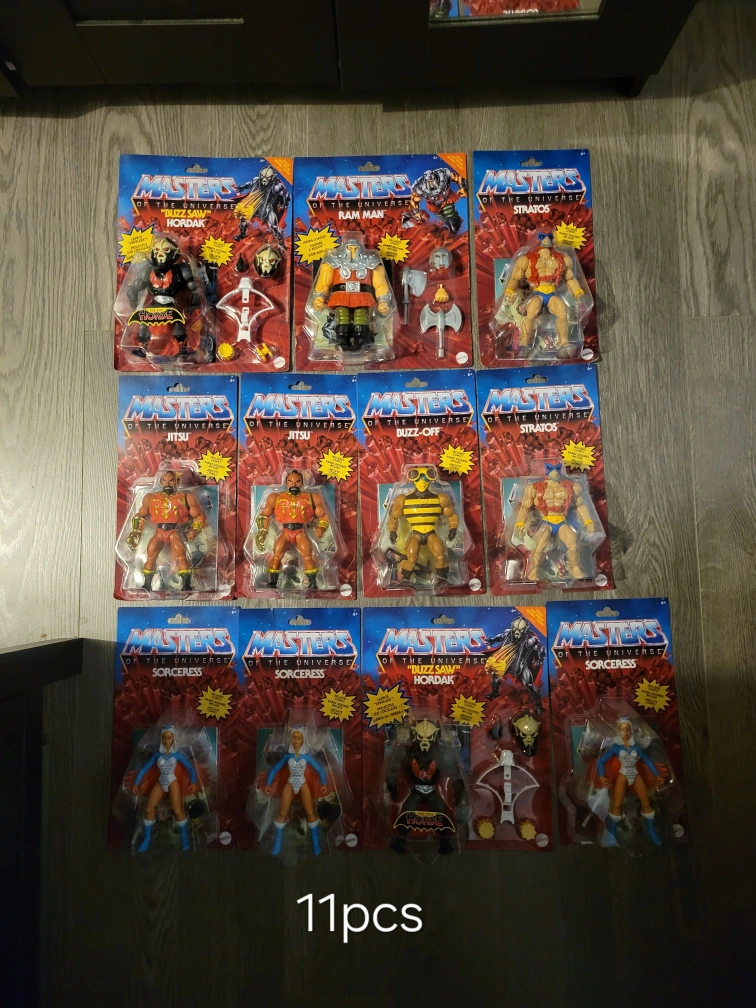 Selling a collection of 11 Masters of the Universe action figures! Includes characters like Hordak, Ram Man, Stratos, Jitsu, Buzz-Off, and Sorceress. All figures are in their original packaging.