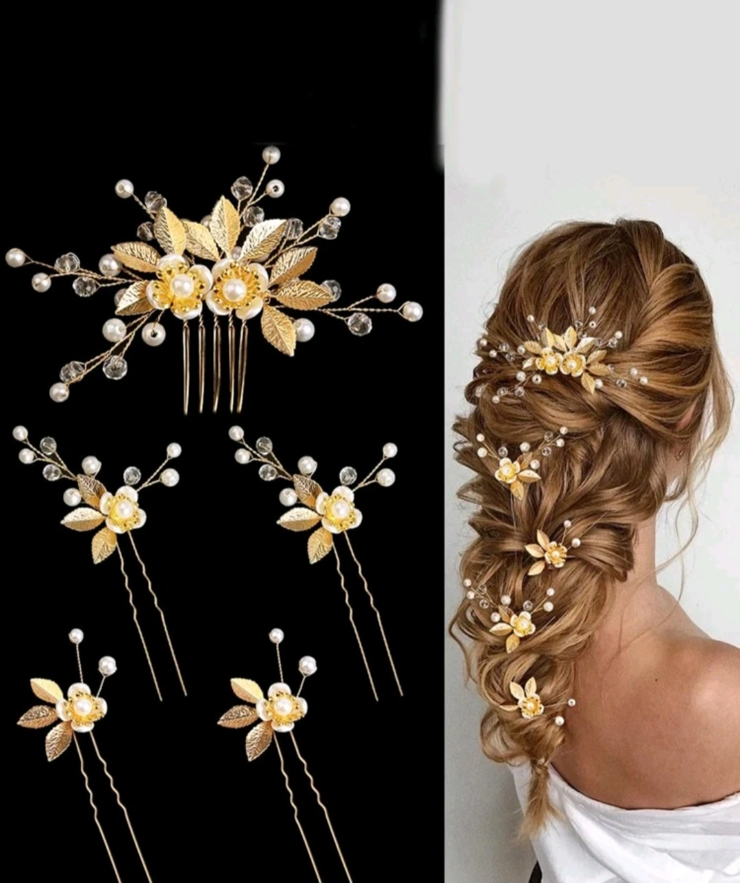 Add a touch of elegance to your hairstyle with this beautiful set of gold flower hair accessories! It includes a decorative comb and several individual hair pins, all adorned with delicate gold leaves, flowers, and pearl-like beads. Perfect for weddings, special occasions, or just adding a bit of sparkle to your everyday look