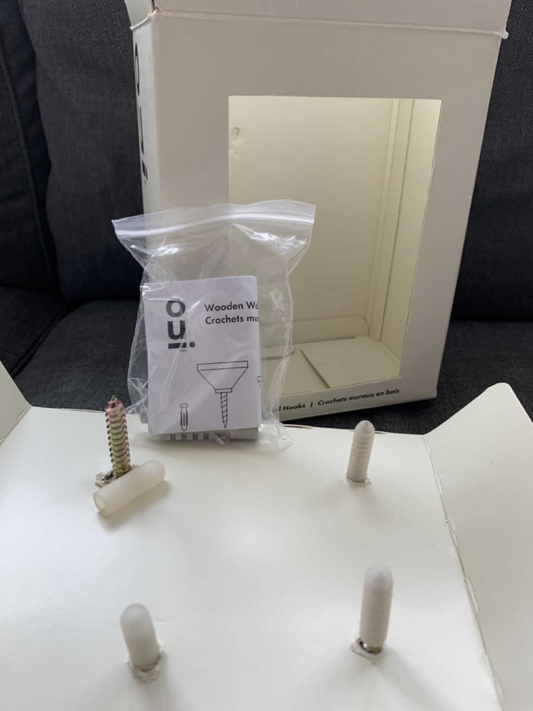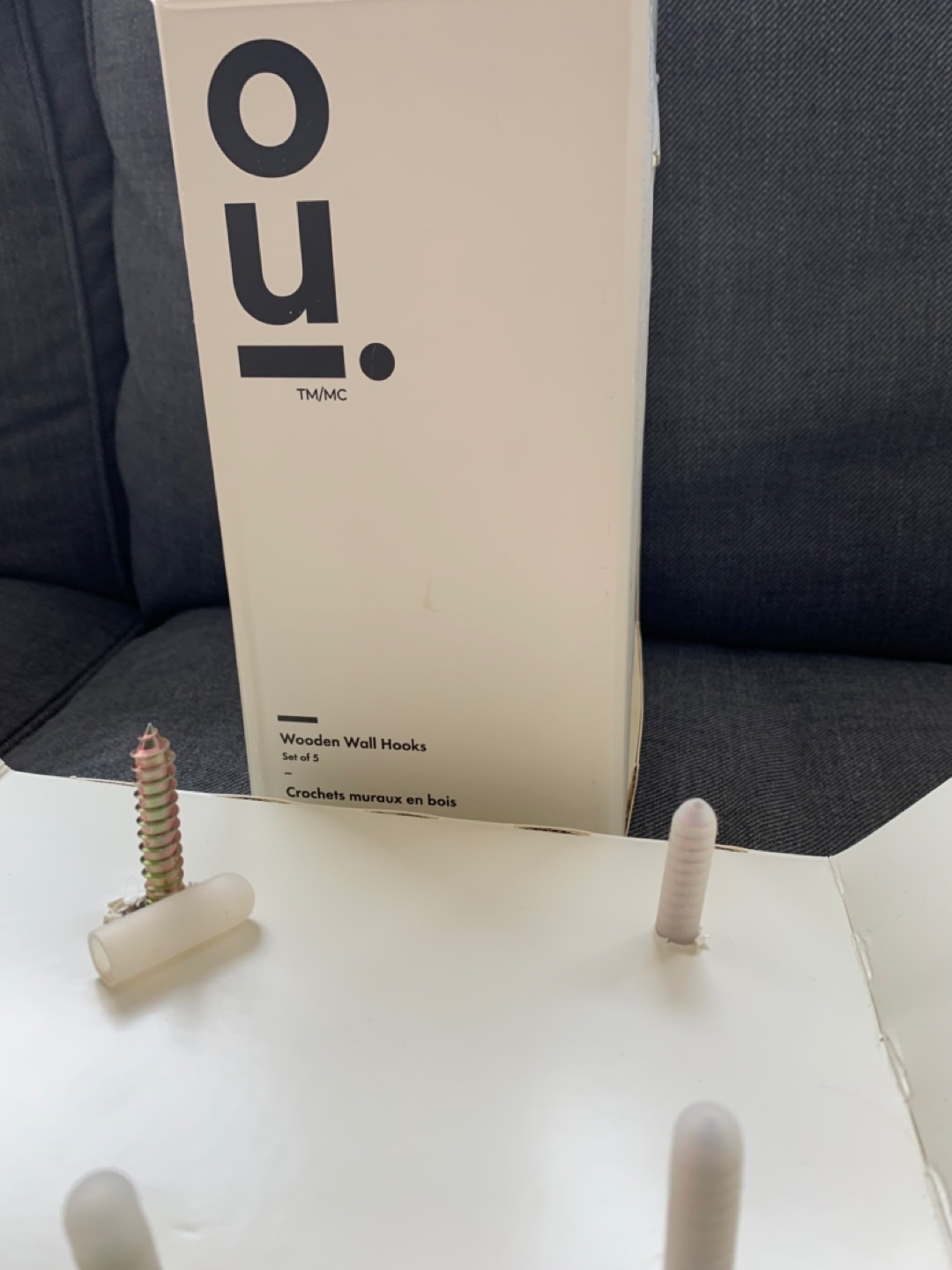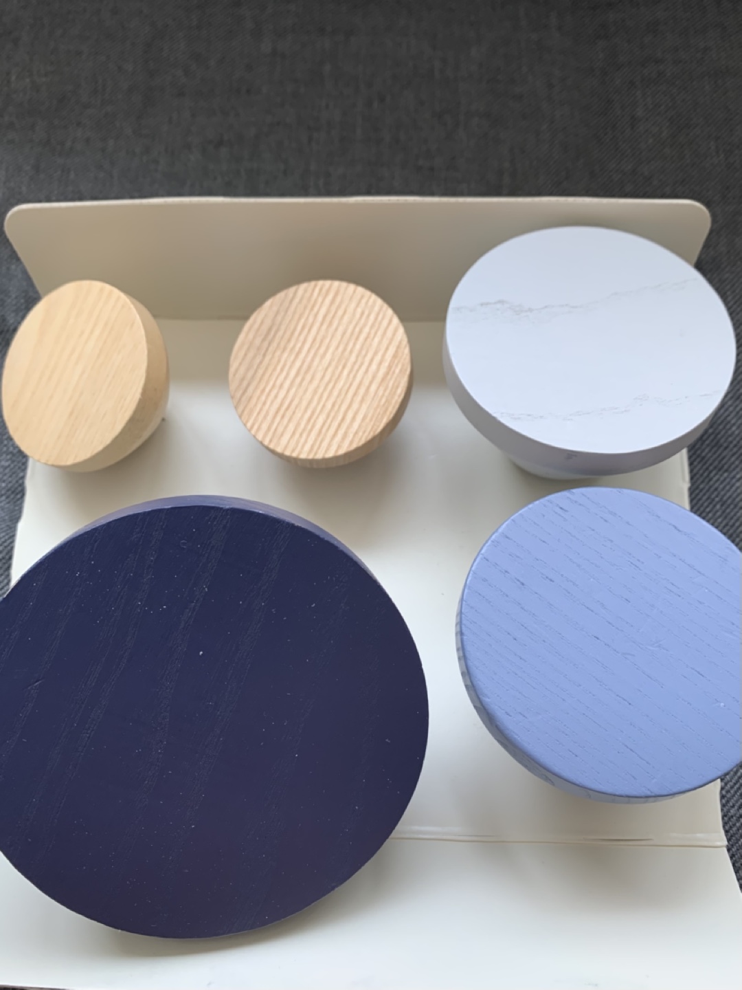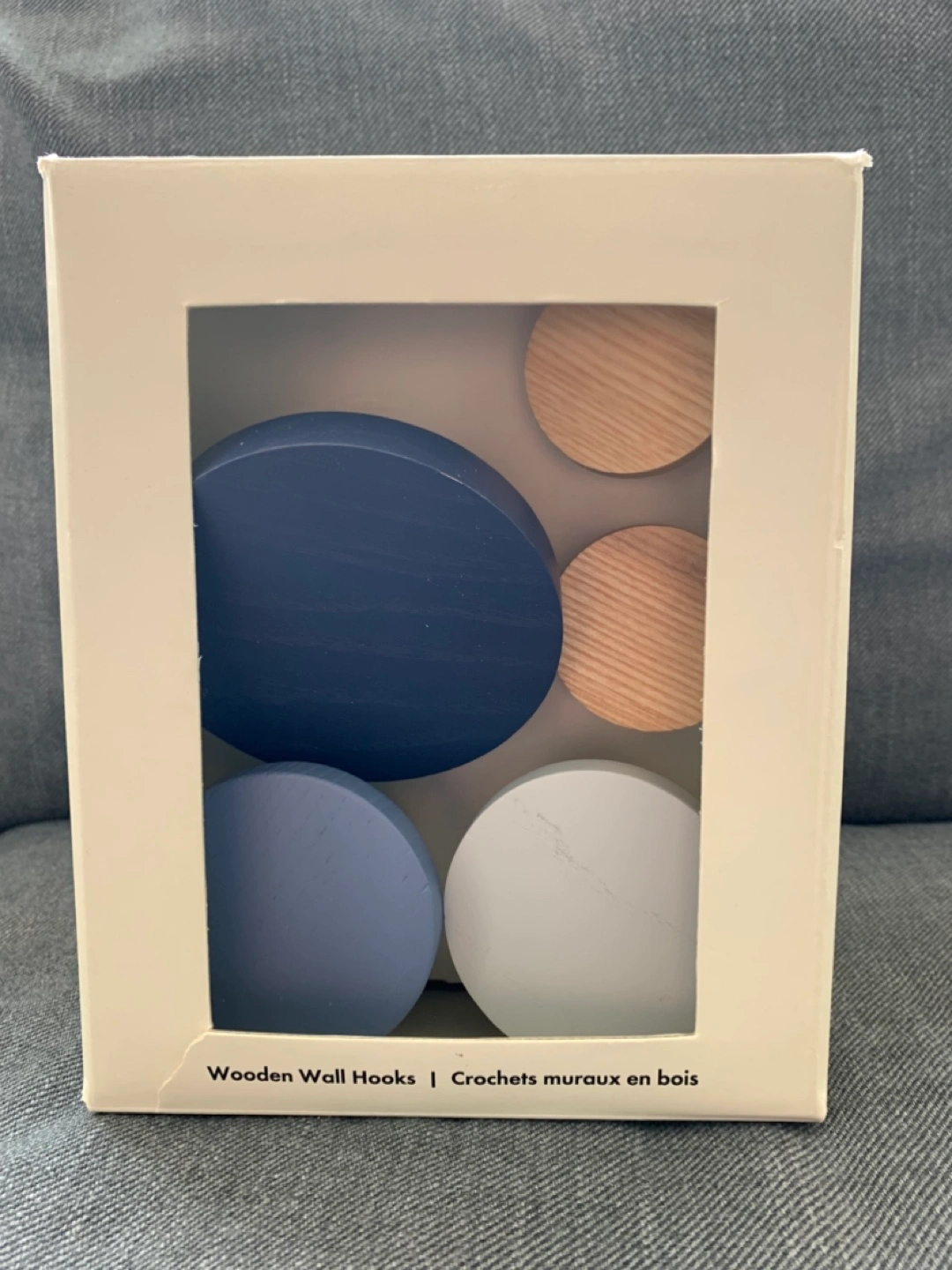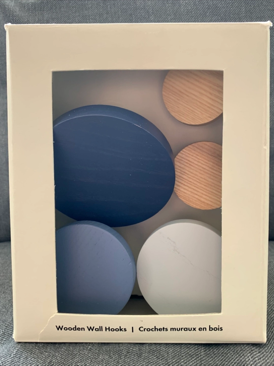 Selling a set of 5 Indigo Oui wooden wall hooks! These hooks come in a variety of colours, including natural wood, white marble, light blue, and dark blue. These are brand new and come in the original box with all the mounting hardware. Originally bought for $32.50.
