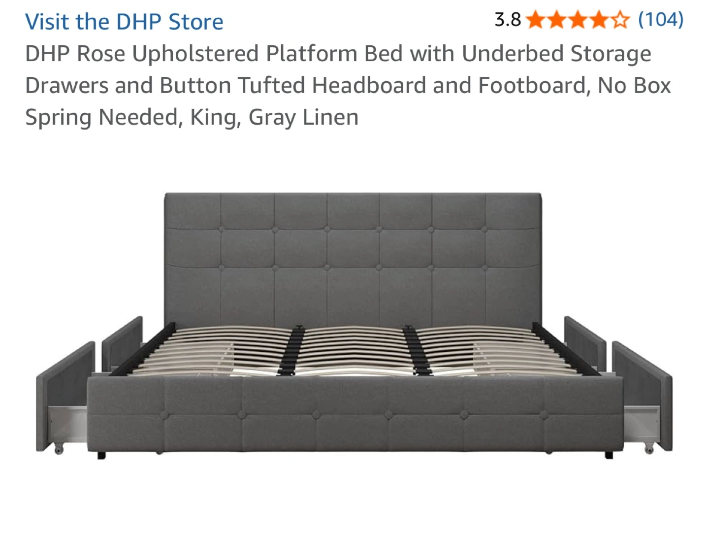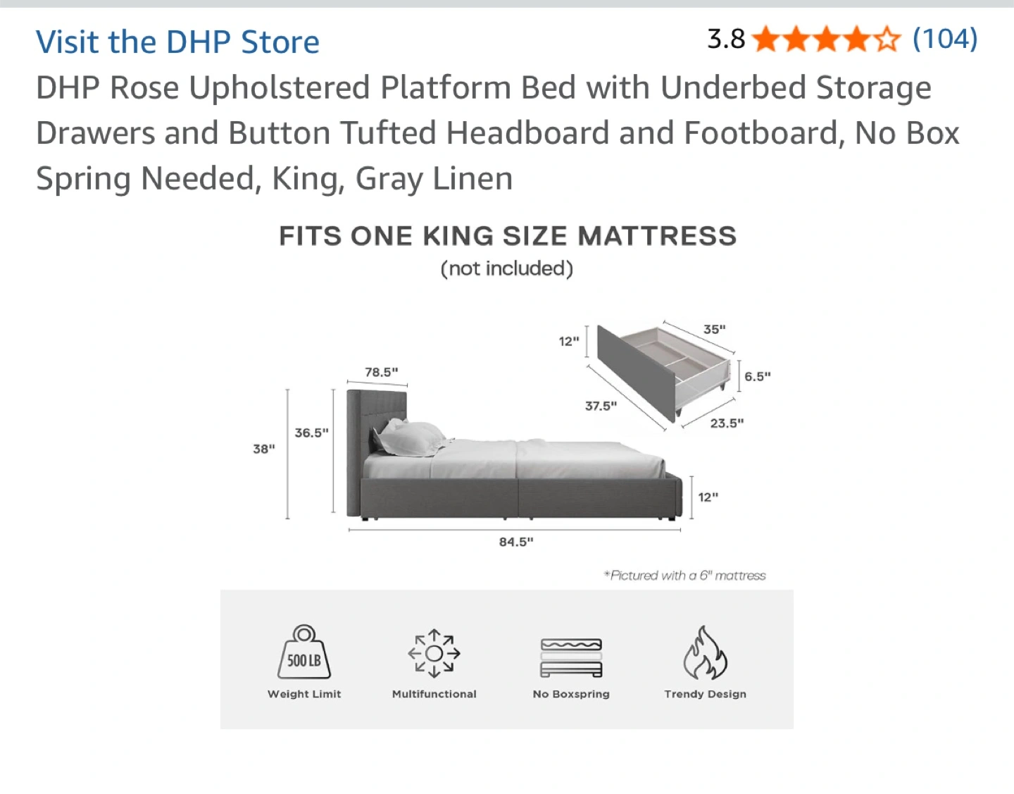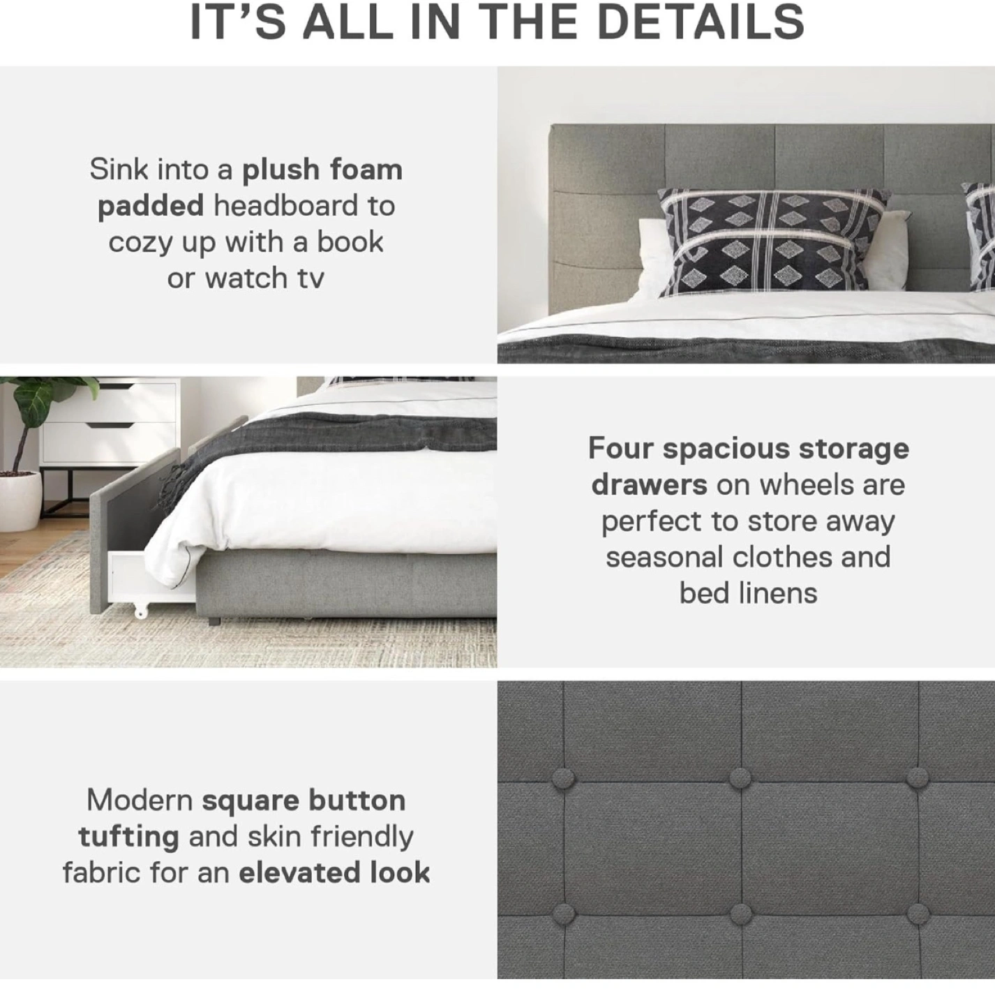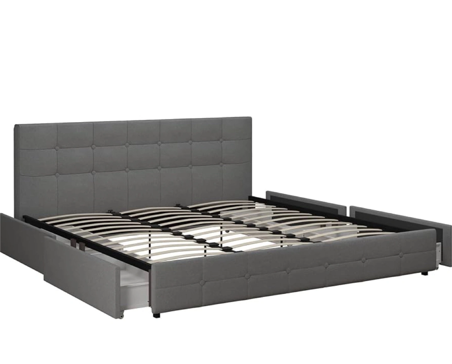 21PICK UP ONLY AND WILL BE UNDONE This is a DHP Rose upholstered platform bed in king size with a gray linen finish. It features underbed storage drawers and a button-tufted headboard and footboard. No box spring is needed! The secured slats stay put to prevent noise, and the raised sides keep the mattress in place. Also features reinforced center legs and metal rail. The bed includes four spacious storage drawers on wheels for storing seasonal clothes and bed linens. The dimensions are approximately 78.5" x 84.5".