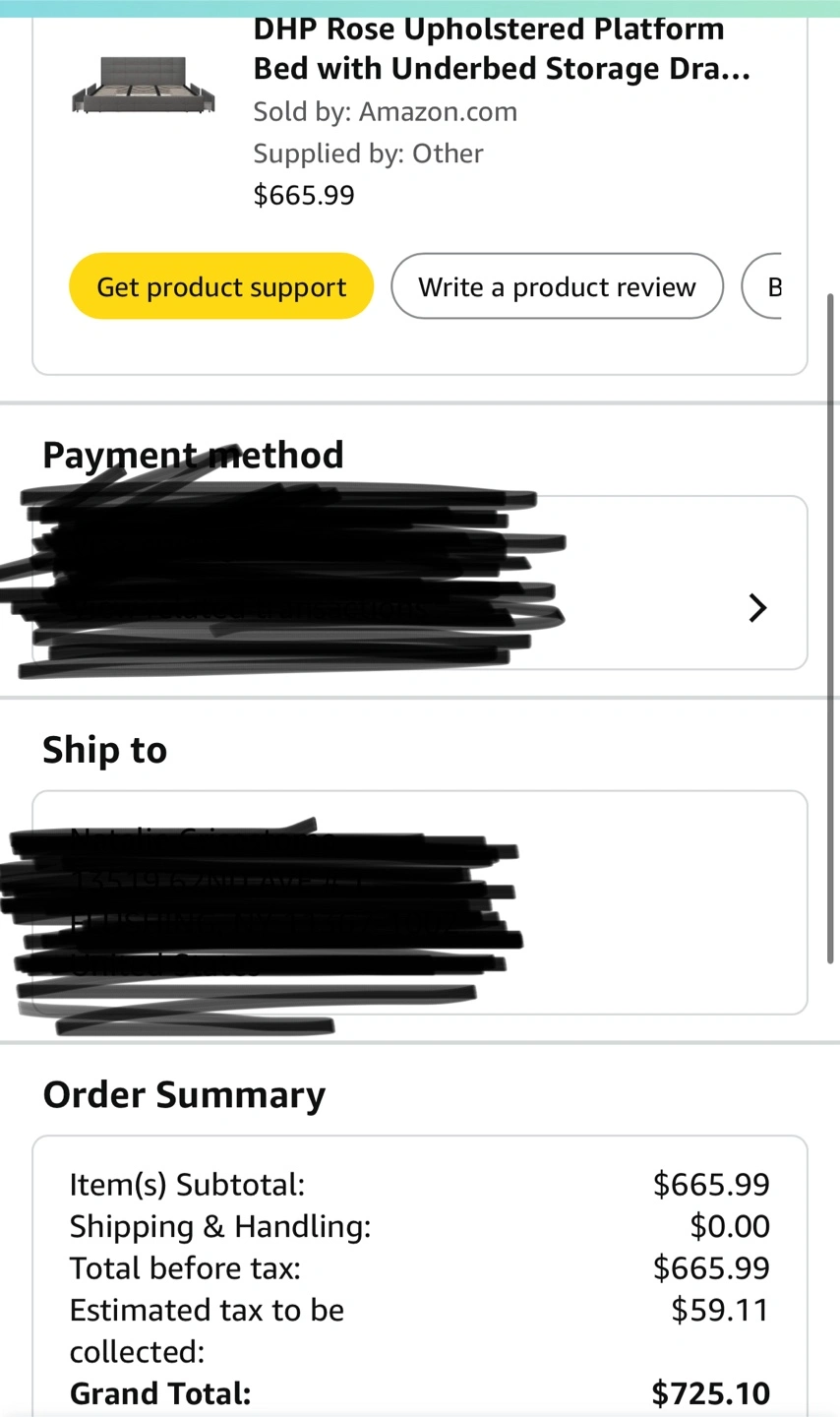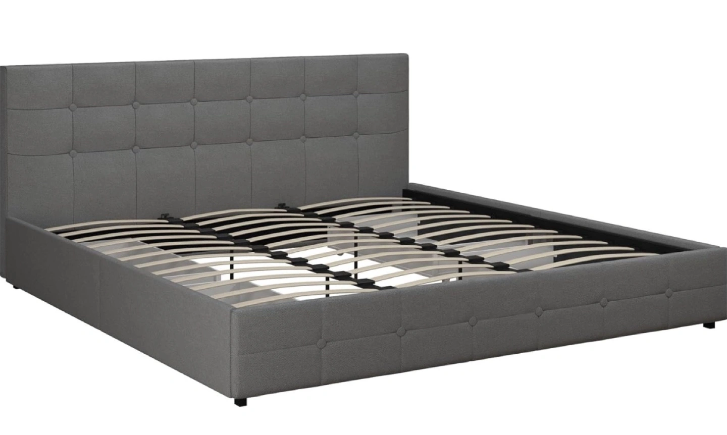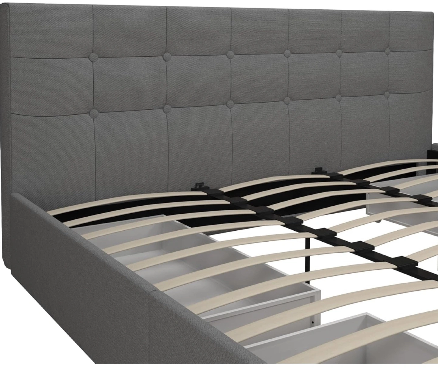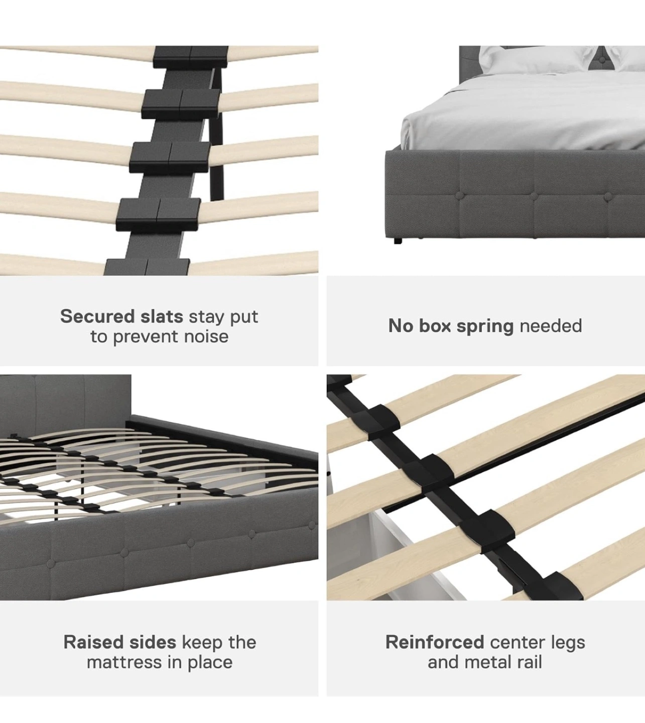 21PICK UP ONLY AND WILL BE UNDONE This is a DHP Rose upholstered platform bed in king size with a gray linen finish. It features underbed storage drawers and a button-tufted headboard and footboard. No box spring is needed! The secured slats stay put to prevent noise, and the raised sides keep the mattress in place. Also features reinforced center legs and metal rail. The bed includes four spacious storage drawers on wheels for storing seasonal clothes and bed linens. The dimensions are approximately 78.5" x 84.5".