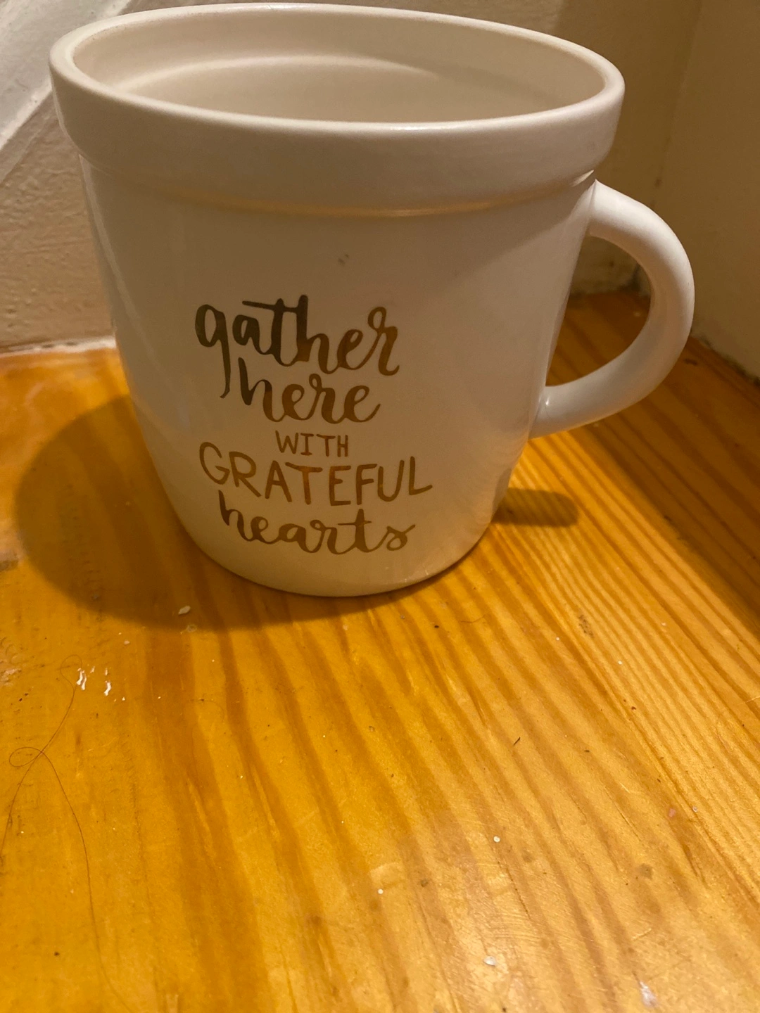 A cute white mug with the phrase "gather here with grateful hearts" in gold lettering. Perfect for coffee, tea, or hot chocolate!